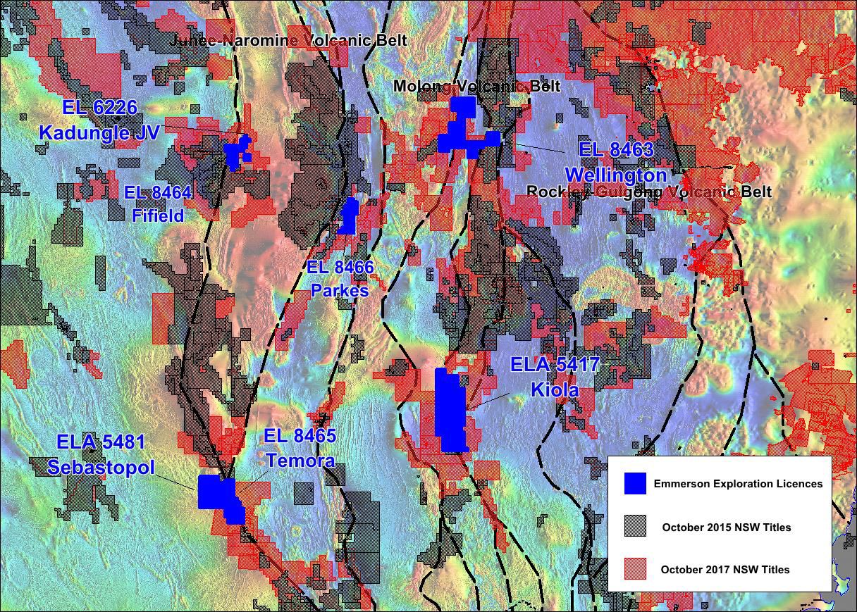 Emmerson continues to monitor and review potential new projects from third parties. To date no such projects have been sufficiently compelling to displace our internally generated projects. To this end we have recently applied for a large tenement in northern NSW (ELA 5621 Nyngan, see figure 1 in link below). This tenement is undercover but from previous exploration, contains some highly encouraging attributes suggesting a continuation of the highly prospective Macquarie Arc to the north. These Macquarie Arc rocks are the host to all of the major deposits in NSW and this new tenement presents an excellent opportunity to hold 100% ownership in a large area highly prospective for gold and copper.