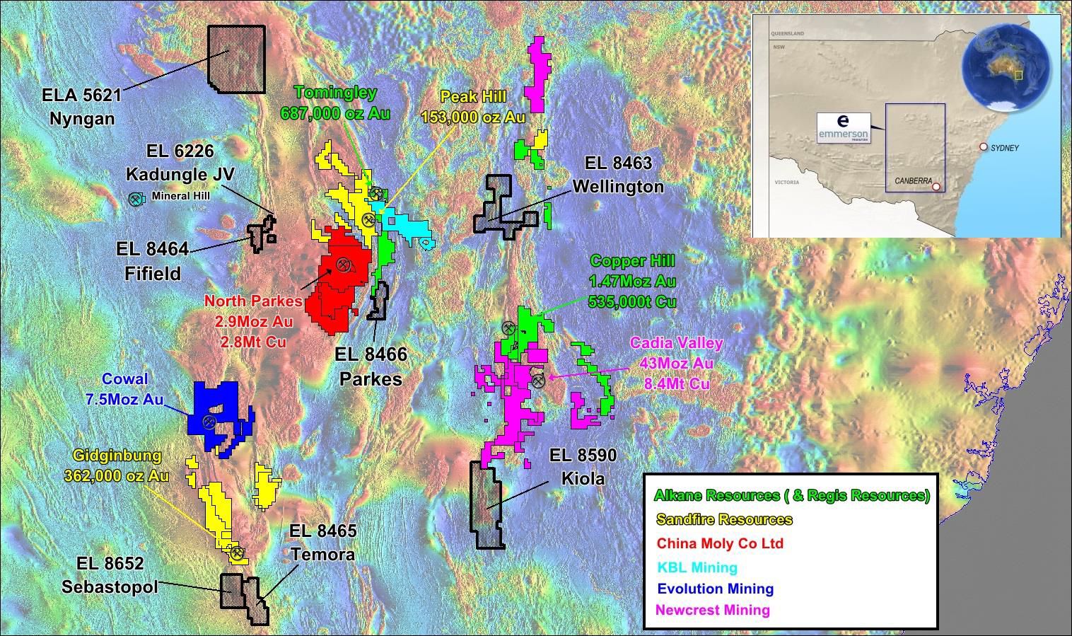 Emmerson Resources Limited (ASX:ERM) (FRA:42E) recently commenced exploration on new gold-copper projects in NSW, identified (with our strategic alliance partner Kenex Limited) from the application of 2D and 3D predictive targeting models – aimed at increasing the probability of discovery. The highly prospective Macquarie Arc in NSW hosts >80Mozs gold and >13Mt copper with these resources heavily weighted to areas of outcrop or limited cover. Emmerson's five exploration projects contain many attributes of the known deposits within the Macquarie Arc but remain under explored due to historical impediments, including an overlying cover (plus farmlands) and a lack of exploration focus. Kadungle is a JV with Aurelia Metals covering 43km2 adjacent to Emmerson's Fifield project.
