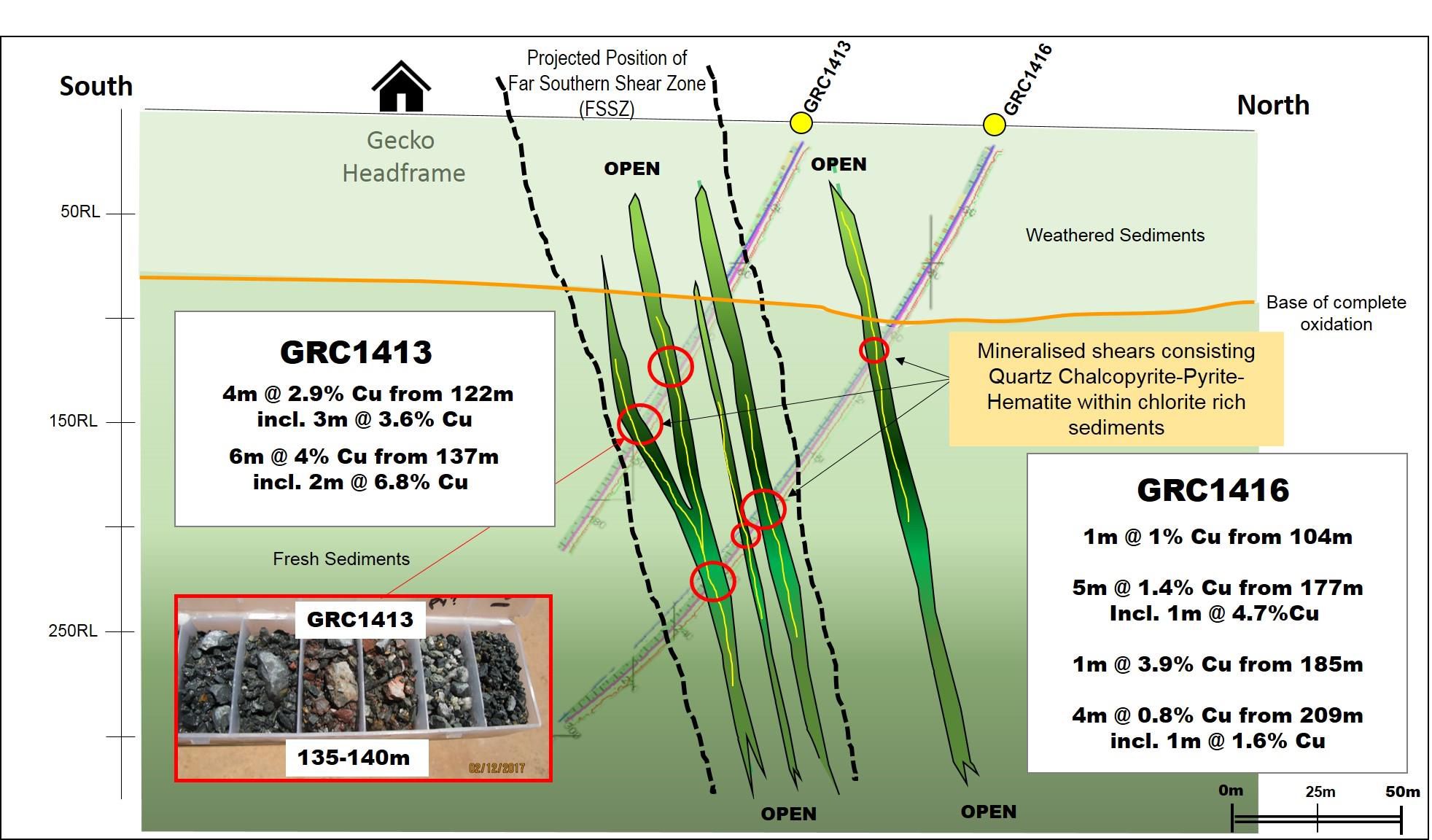 This supports the previously announced mineralisation in drill hole GODD032 of 7m at 5.98% copper and 3m at 4.75% copper (ASX- 19 August 2015) (see figure 7 in link below). Some of the other holes were also anomalous in copper and intersected intervals of quartz-hematite gouge likely corresponding with late faulting that has disrupted the overall continuity of the shear zone.
