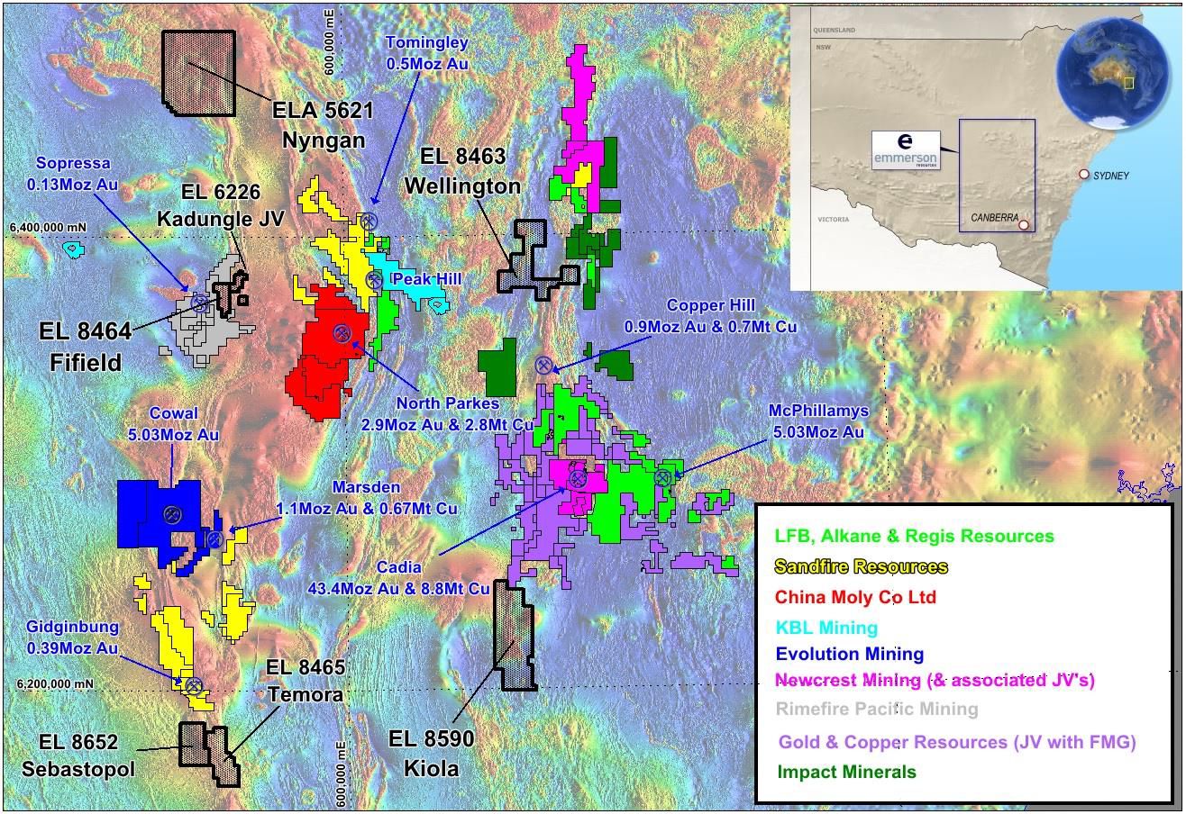 Emmerson has recently commenced exploration on new gold-copper projects in NSW, identified (with our strategic alliance partner Kenex Limited) from the application of 2 and 3D predictive targeting models - aimed at increasing the probability of discovery. The highly prospective Macquarie Arc hosts >80Mozs gold and >13Mt copper but with these resources heavily weighted to areas of outcrop or limited cover. Emmerson's five exploration projects contain many attributes of the known deposits within the Macquarie Arc but remain under explored due to historical impediments, including overlying cover (plus farm lands) and a lack of exploration focus. Kadungle is a JV with Aurelia Metals covering 43km2 adjacent to Emmerson's Fifield project.