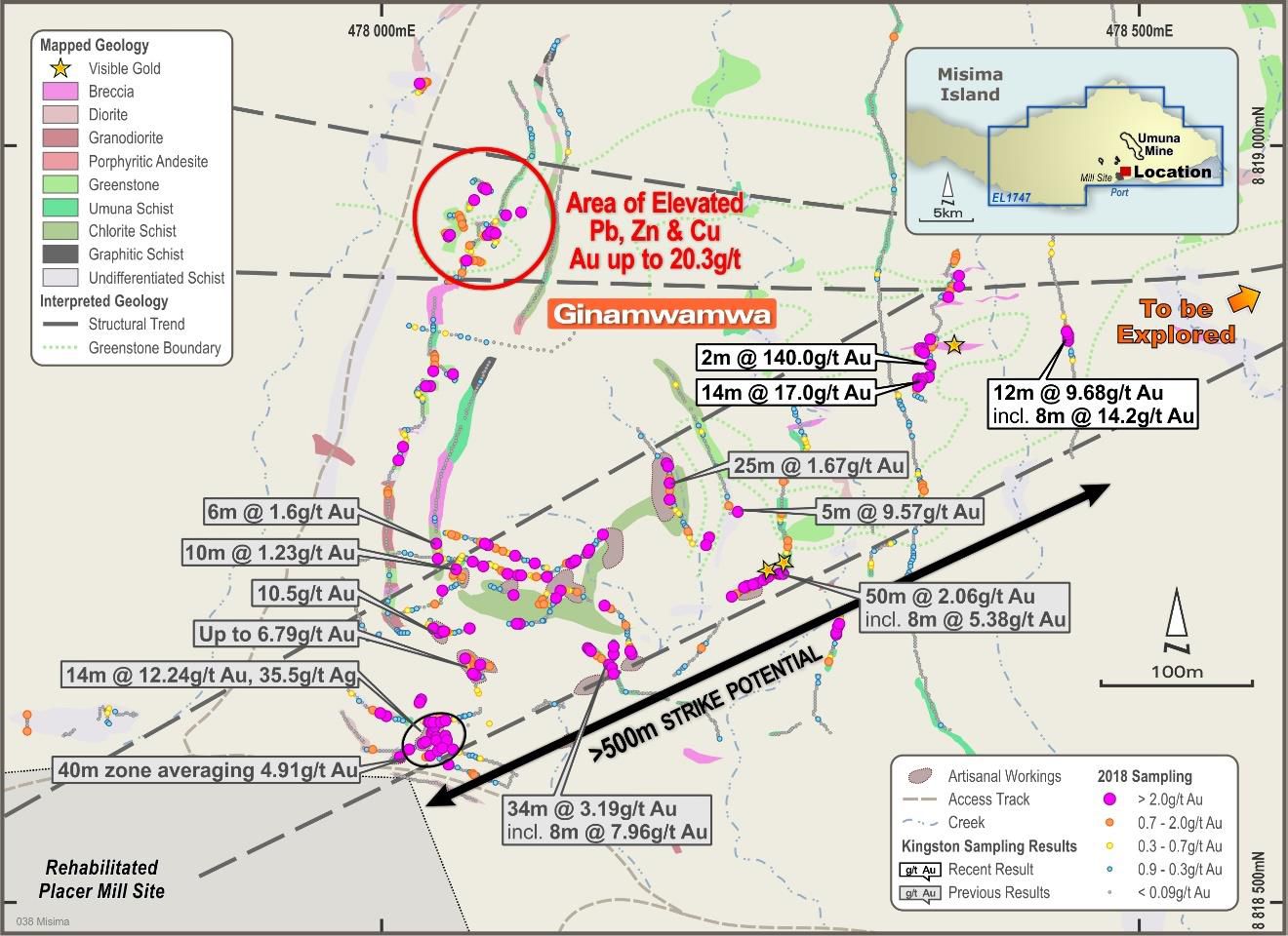 ASX:KSN) (Kingston or the Company) is pleased to announce further high-grade gold assays in surface geochemistry at the Company's Misima Gold Project (KSN 70%).