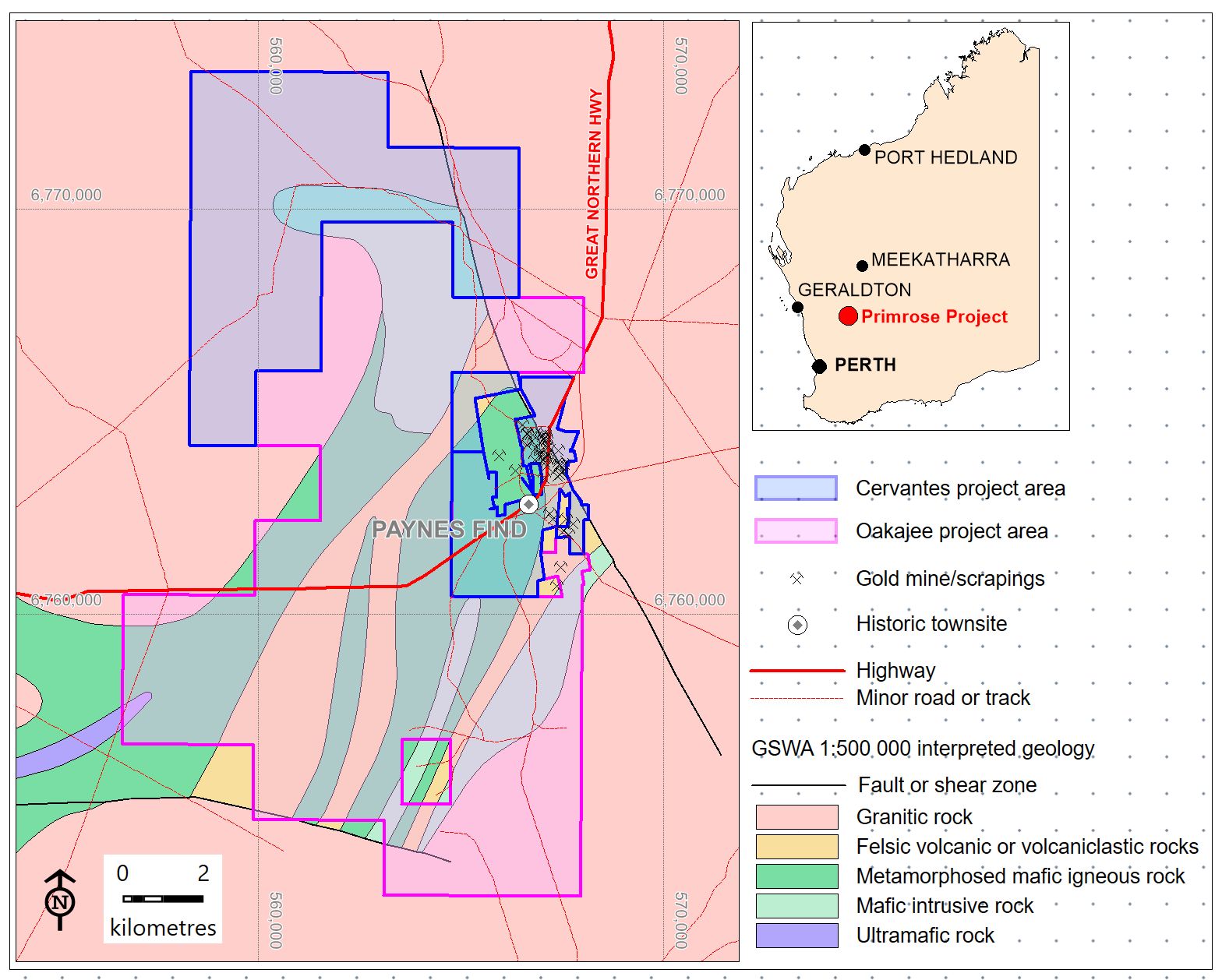 Oakajee recently announced the potential to earn into 80% of a number of tenements including Mining Leases and Exploration and Prospecting Licenses covering some 112 sq km, effectively surrounding Cervantes's "Primrose Project" in Payne's Find.
