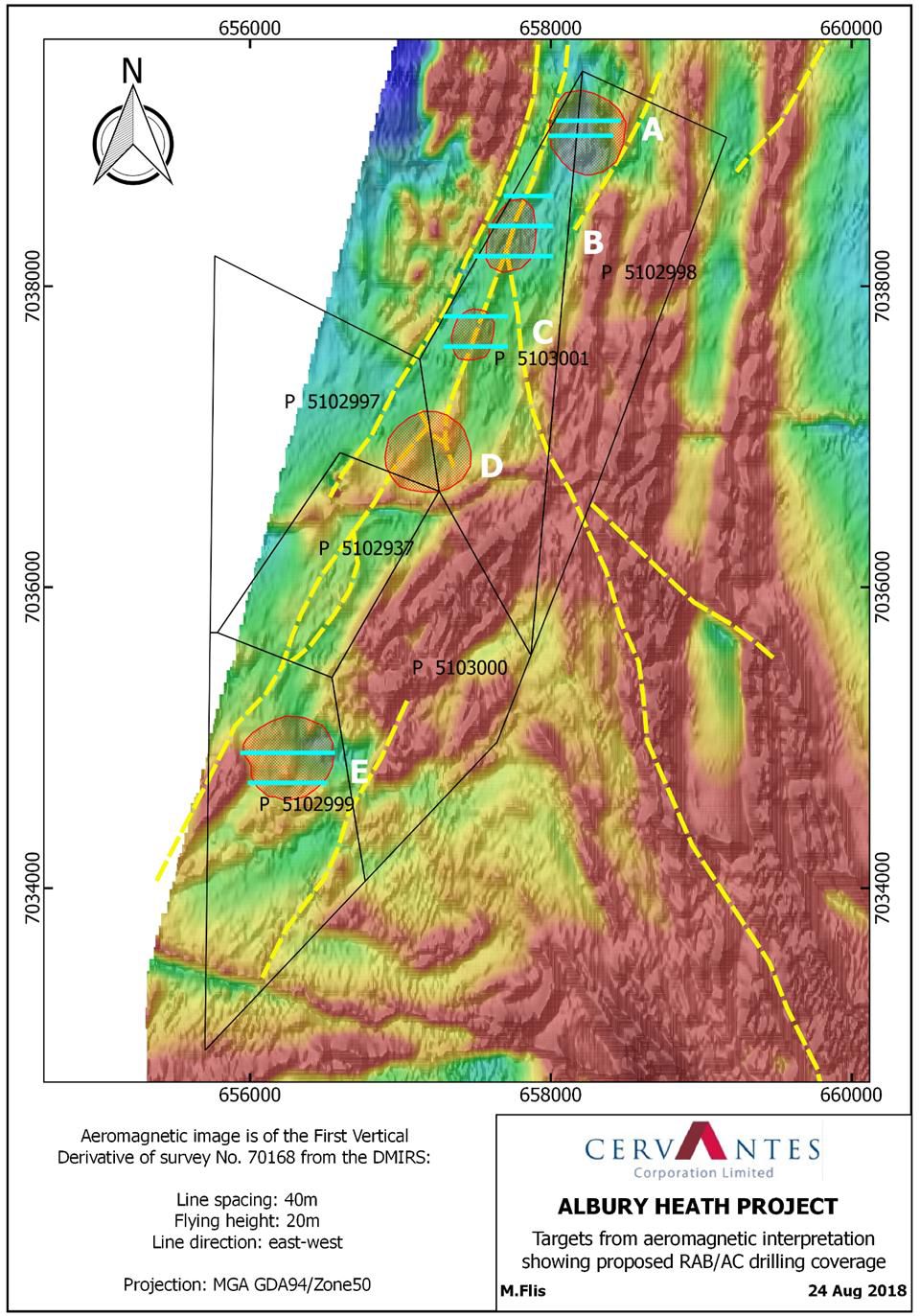 Interpretation of aeromagnetic data over Cervantes' tenements in the Albury Heath Project has identified a number of possible repetitions of the Albury Heath Mine structural setting. Five target areas have been outlined. All are associated with either the Mt Magnet-Tuckabianna fault belt on which the Albury Heath Mine is located, or the Gabanintha Fault, or the intersection of the two (see Figure 5 in link below). Both these faults are associated with major gold mineralisation in the district. Surprisingly, there has been only very limited exploration activity over these areas, previous workers having focussed on the area directly around the historic mine.
