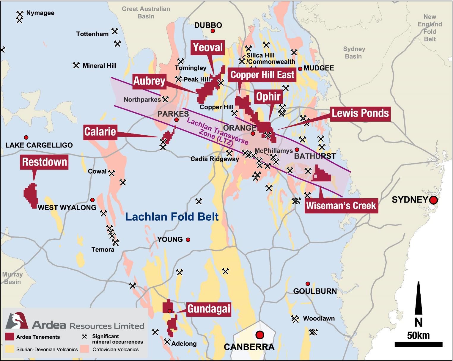 Ardea controls a suite of highly-prospective tenements in NSW within the Lachlan Fold Belt (see Figure 1 in link below) which hosts multiple bulk-tonnage deposits such as Northparkes, Cadia-Ridgeway and Cowal.