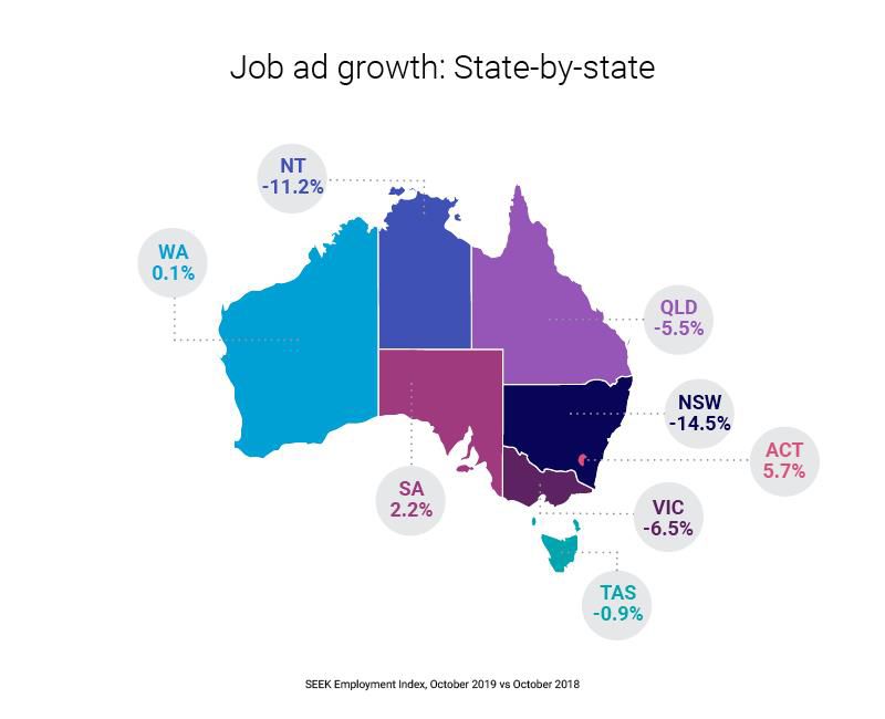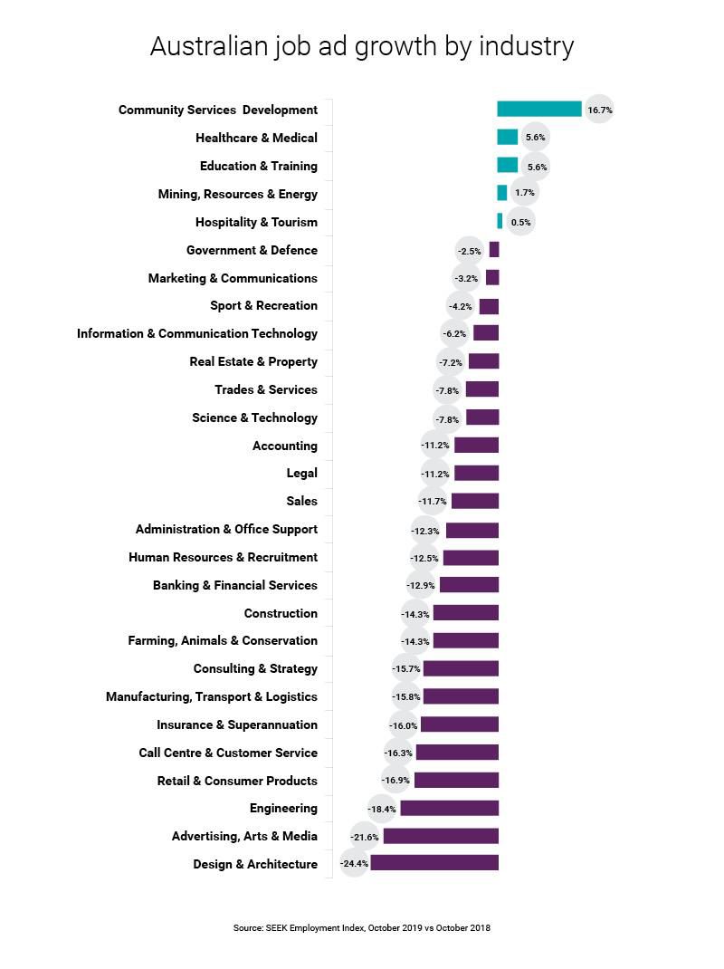 Community Services & Development (16.7%) led as the sector with the highest job ad growth for October 2019 (vs. October 2018), followed by Healthcare & Medical (5.6%) and Education & Training (5.6%).