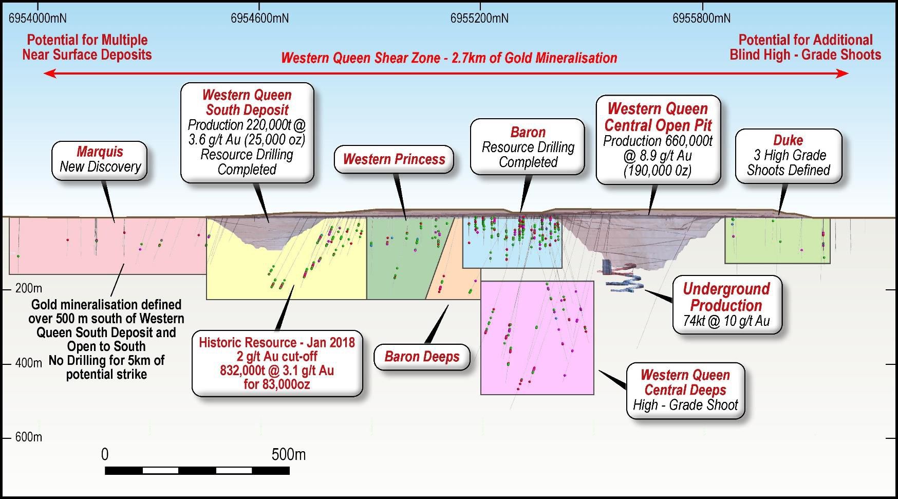 The project is located within the Warda Warra north-south trending mineralised greenstone belt which is 35km in length and up to 3km in width. The greenstone belt hosts the mineralised Western Queen Shear Zone which is up to 50m in width and hosts a series of high-grade gold deposits including two mined deposits for a combined historic production of 880,000t @ 7.6 g/t Au for 215,000oz.