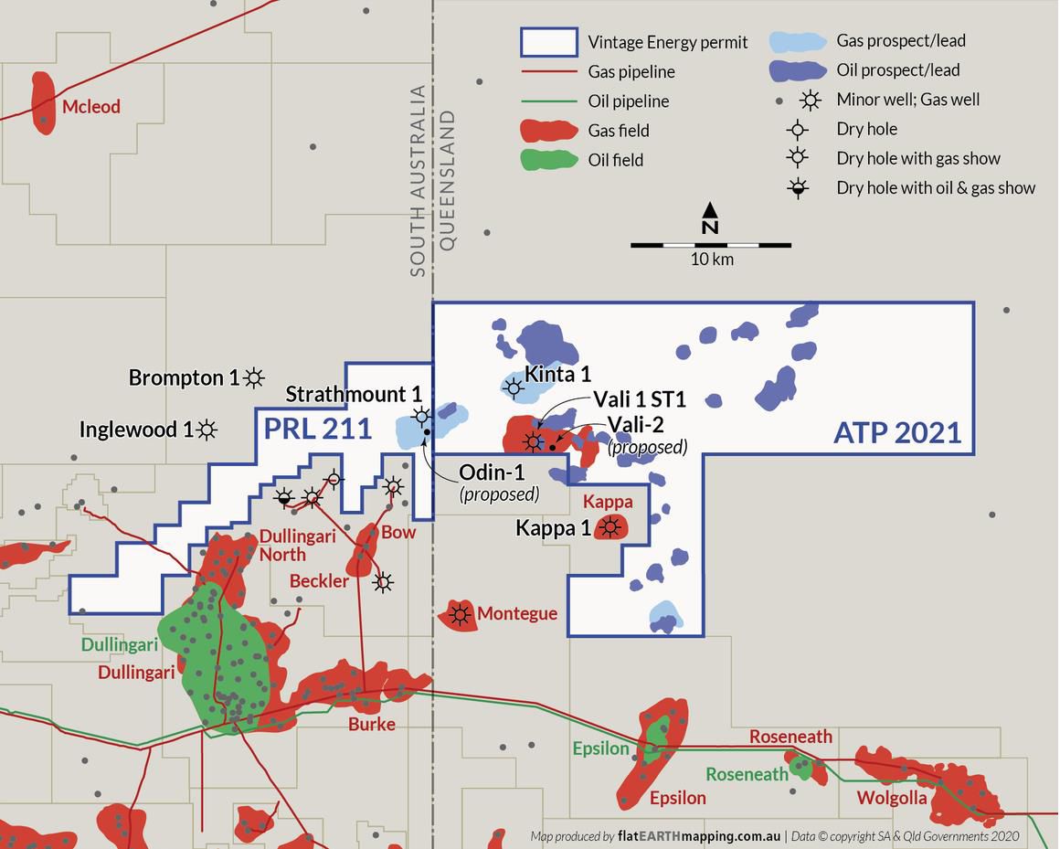 Once Vali-2 has been drilled the SLR-184 rig will move to the Odin-1 location in South Australia. Odin-1 is being drilled to address large fault bounded Toolachee and Patchawarra Formation closures, up dip of Strathmount-1, a discovery well drilled in 1987 but plugged and abandoned as a non-commercial hydrocarbon accumulation at that time. Strathmount-1 is interpreted to have conventional gas pay in the Toolachee Formation and both conventional and low permeability gas pay in the Patchawarra Formation. Stratigraphically trapped gas outside of mapped closure provides possible gas resource upside at Odin.