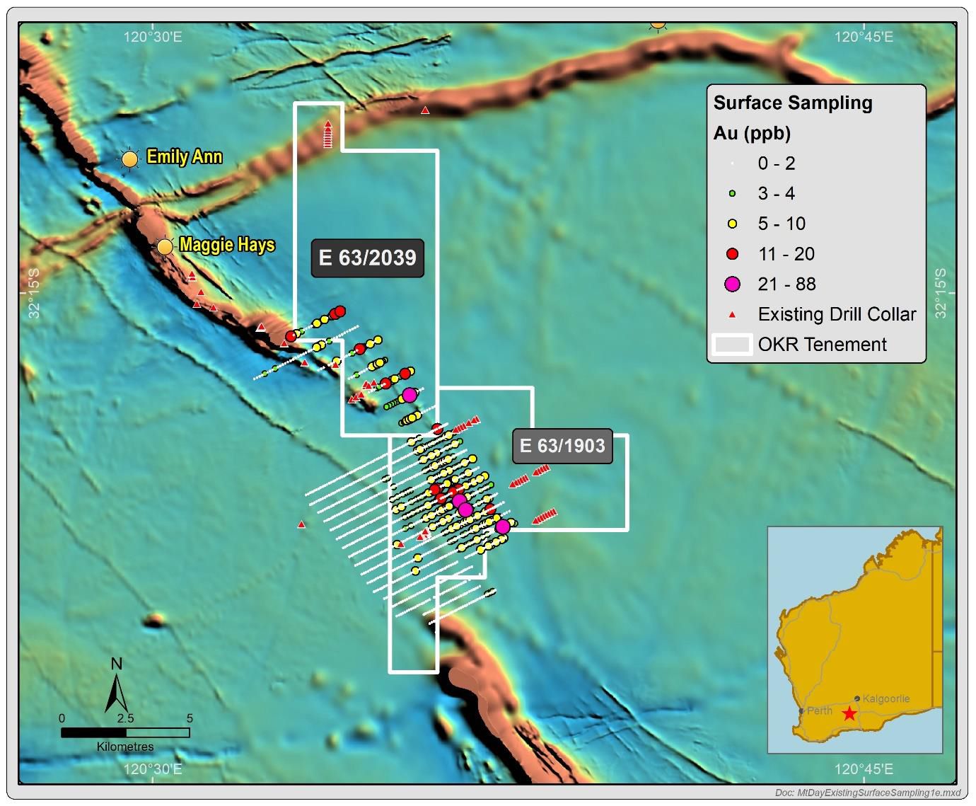 Based on a review of open file historical data Okapi applied for tenement E63/2039 to cover an interpreted structural target and coincident gold in soil anomaly. The tenement also contains the historical Maggie Hays Hill gold workings.