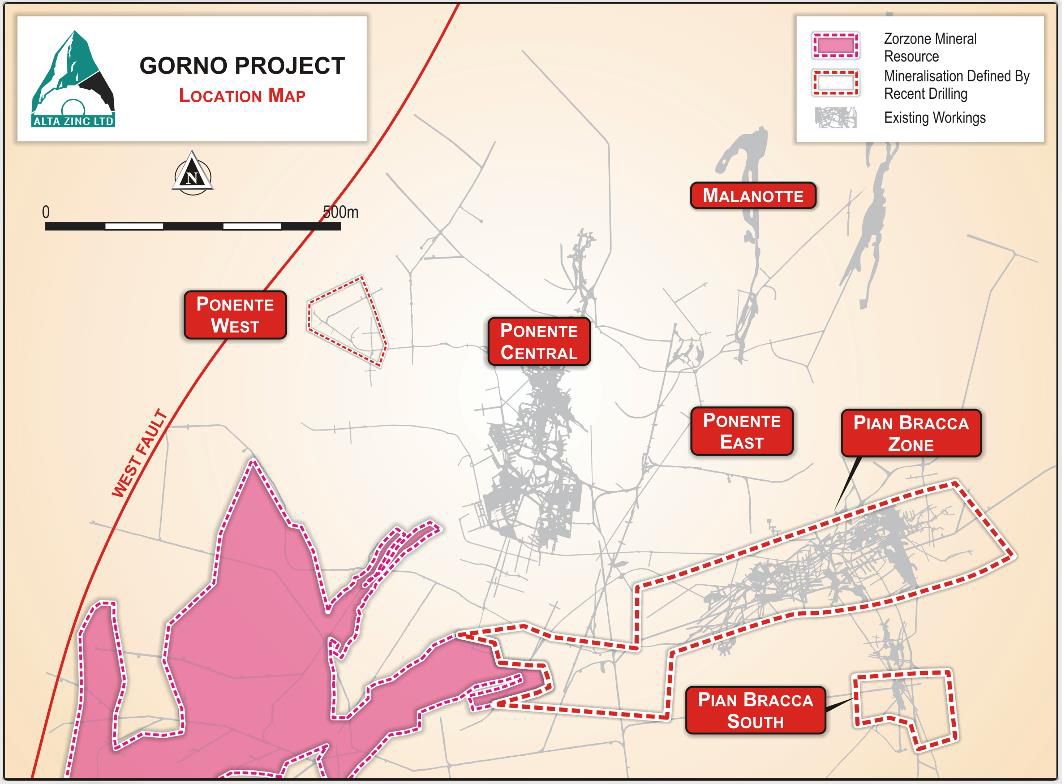 Mineralisation at Ponente remains open to the north-east, east and south. Geological interpretation of historical exploration data suggests the mineralisation may extend approximately 400m to the north-east into an area where historical drilling intersected significant mineralisation and mineralisation is visible in the sidewalls, and approximately 300m to the south where it may extend to the northern end of the current Zorzone Mineral Resource area. These extension areas will be drilled and channel sampled in due course.