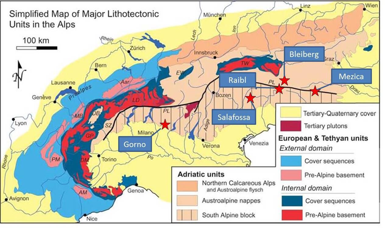 The Gorno Mineral District contains a number of Alpine Type Lead-Zinc deposits (similar to Mississippi Valley Type [MVT] Lead Zinc deposits). They occur within carbonate rocks of Triassic age, deposited in a broadly transgressive platform setting in a rift-sag basin environment (Figure 4*). Mineralisation is generally accepted to be of low-temperature carbonate replacement style (MVT or Irish type) and not related directly to magmatism, and the timing variably interpreted as syngenetic, 'extensional' (early Jurassic), or compressional (Miocene). Gorno shares many fundamental features with other deposits in the Alpine Zn-Pb province, which hosts a number of significant stratabound carbonate-hosted Zn-Pb deposits in Middle to early Upper Triassic carbonates.