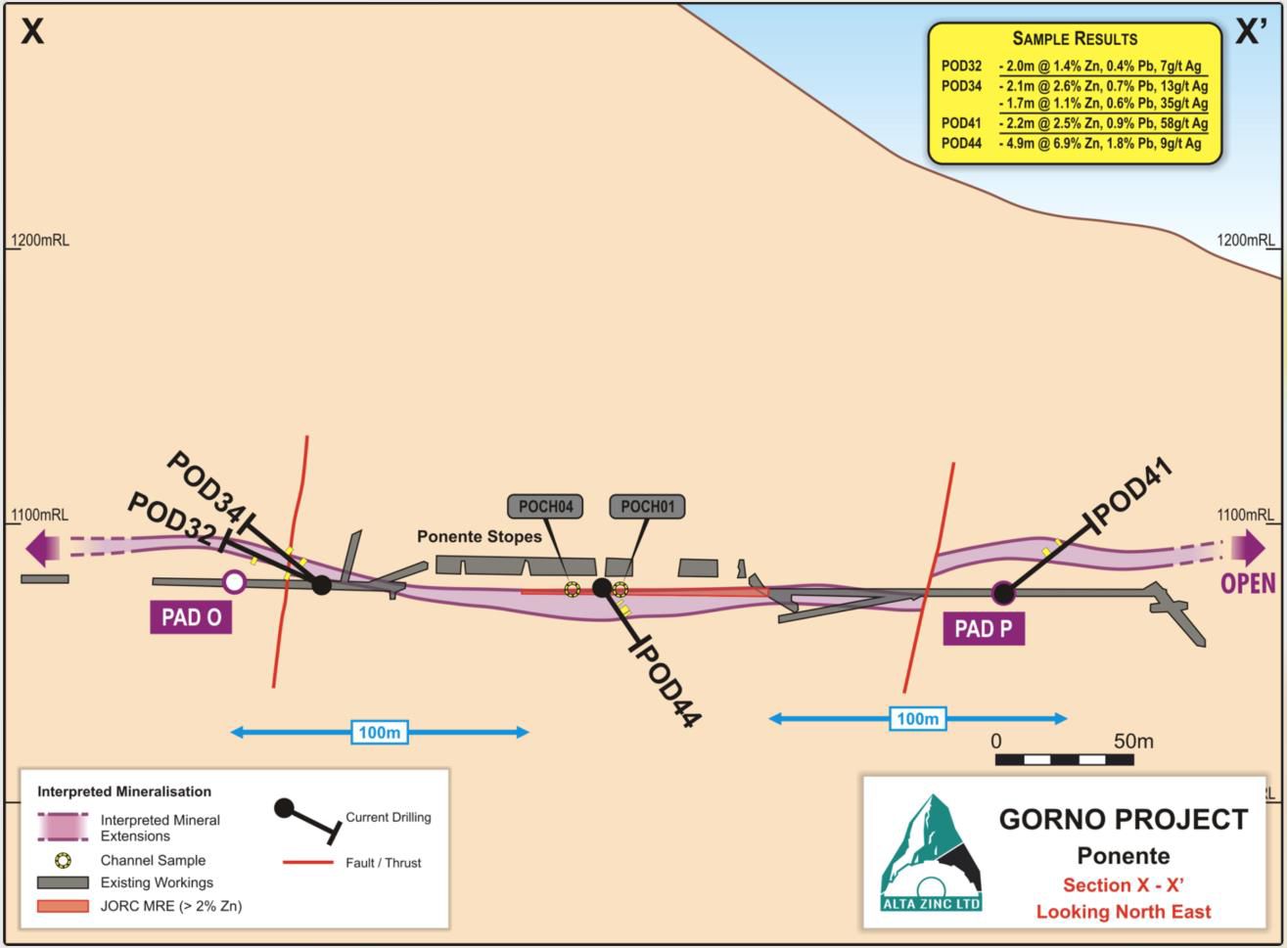Drilling at Ponente intersected mineralisation outside of the Mineral Resource estimate area. Holes POD32, 34 and 41 extend the mineralisation 100m both to the east and west and POD44 intersected 4.9m at 8.6% Zn+Pb increasing the thickness of the known mineralisation.