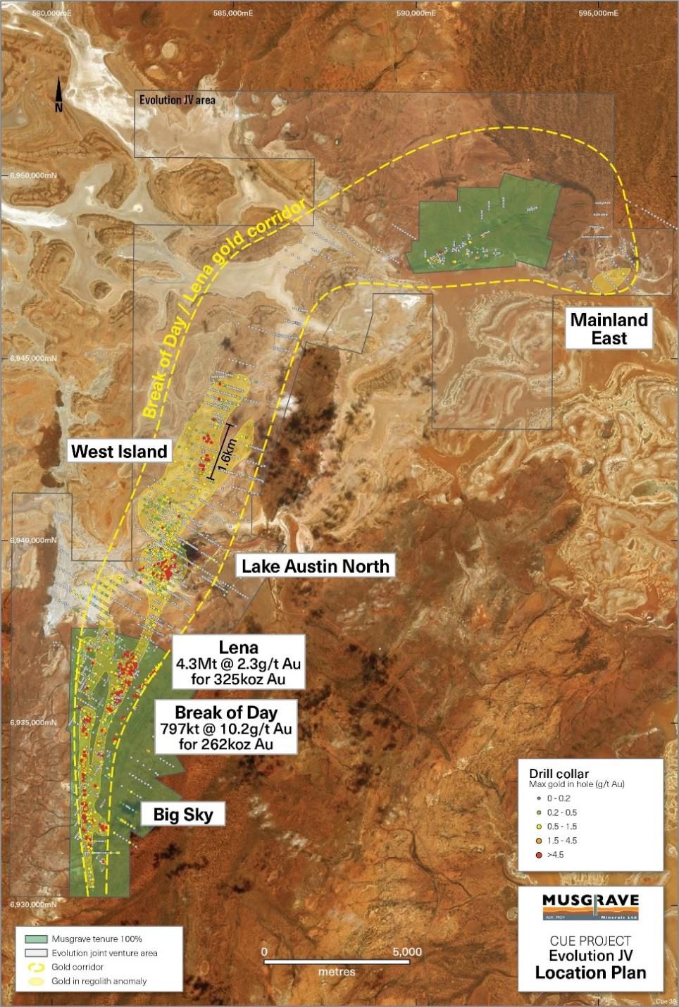 The Evolution JV lies to the north of and excludes all the current resources at Cue (including the Lena and Break of Day deposits), the new White Heat and Big Sky discoveries, and the Mainland option area.