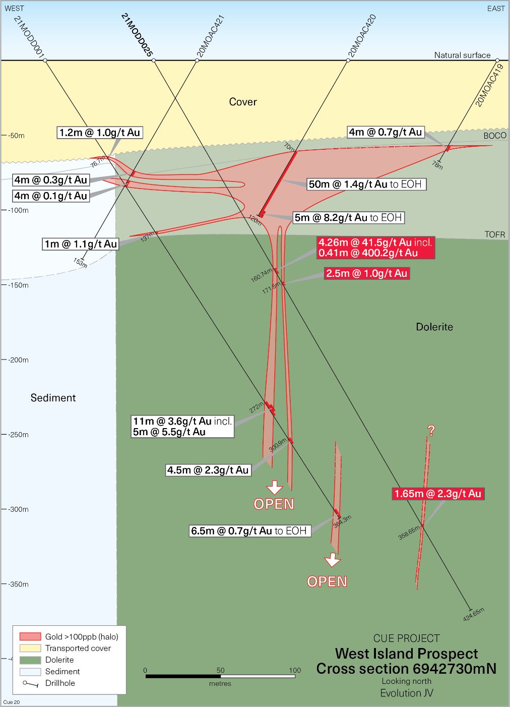 Evolution initially committed to a A$5M exploration budget to fund further drilling at Cue in FY22 and have now increased the JV budget for H2. The intent is to accelerate exploration and to delineate the scale of the gold system at West Island, to test additional gold-in-regolith aircore anomalies and define new diamond drilling targets through aircore drilling. This revised and accelerated budget adds an additional A$3-6M for a revised minimum total budget of A$8M for FY22.