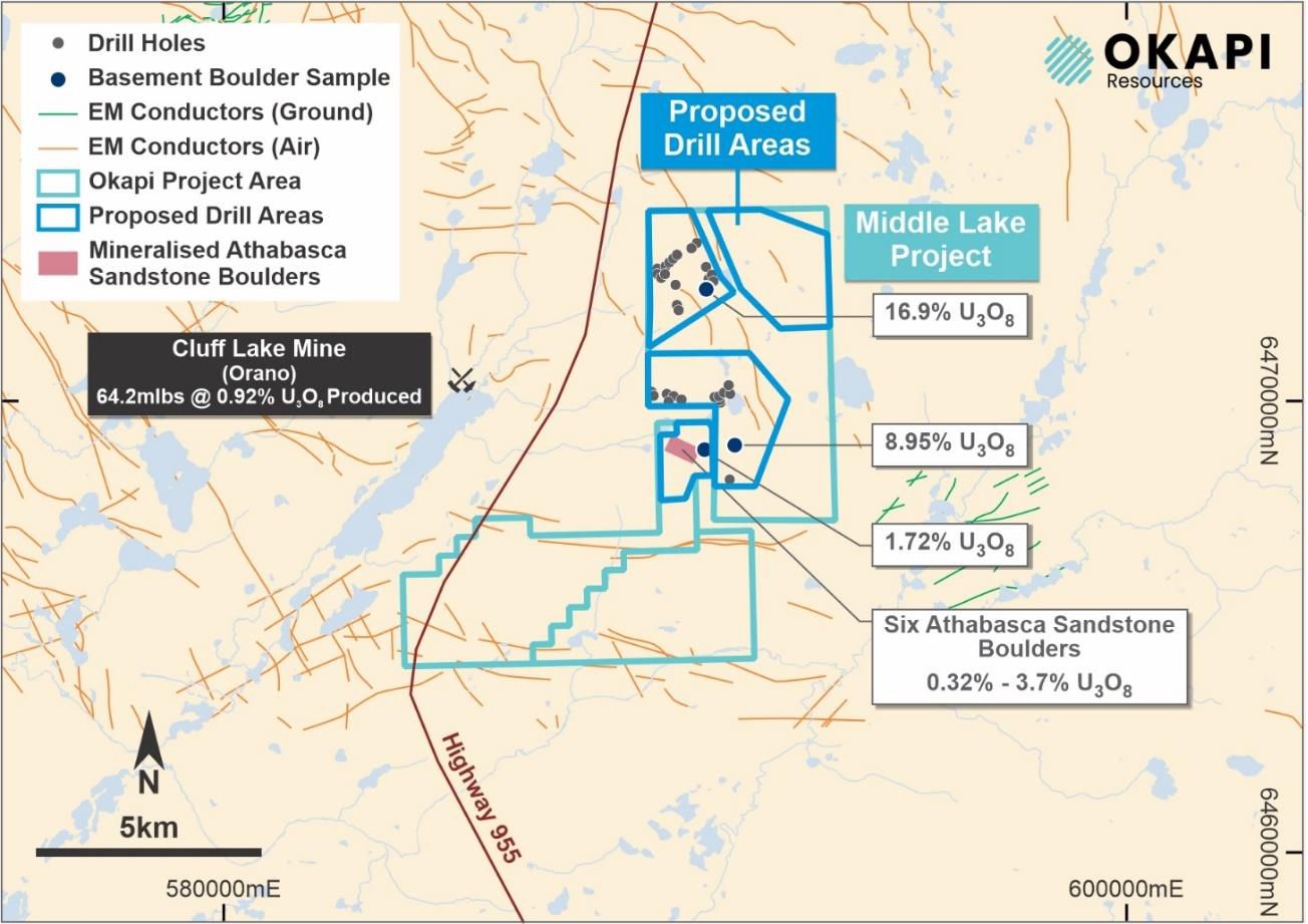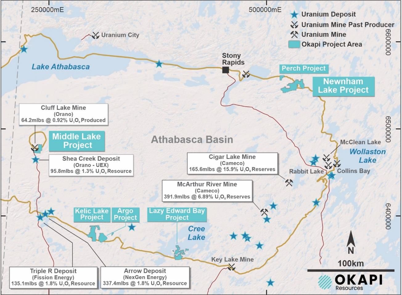 "This is an important milestone for Okapi, as the Company continues to progress and advance its uranium projects in North America. Obtaining a permit to drill at our 80% owned Middle Lake Project in the Athabasca Basin, the world's premier uranium district, provides the opportunity for the company to start exploration work on our highly prospective exploration properties located only 4km from the past producing Cluff Lake Mine which produced approximately 64 million pounds of uranium.