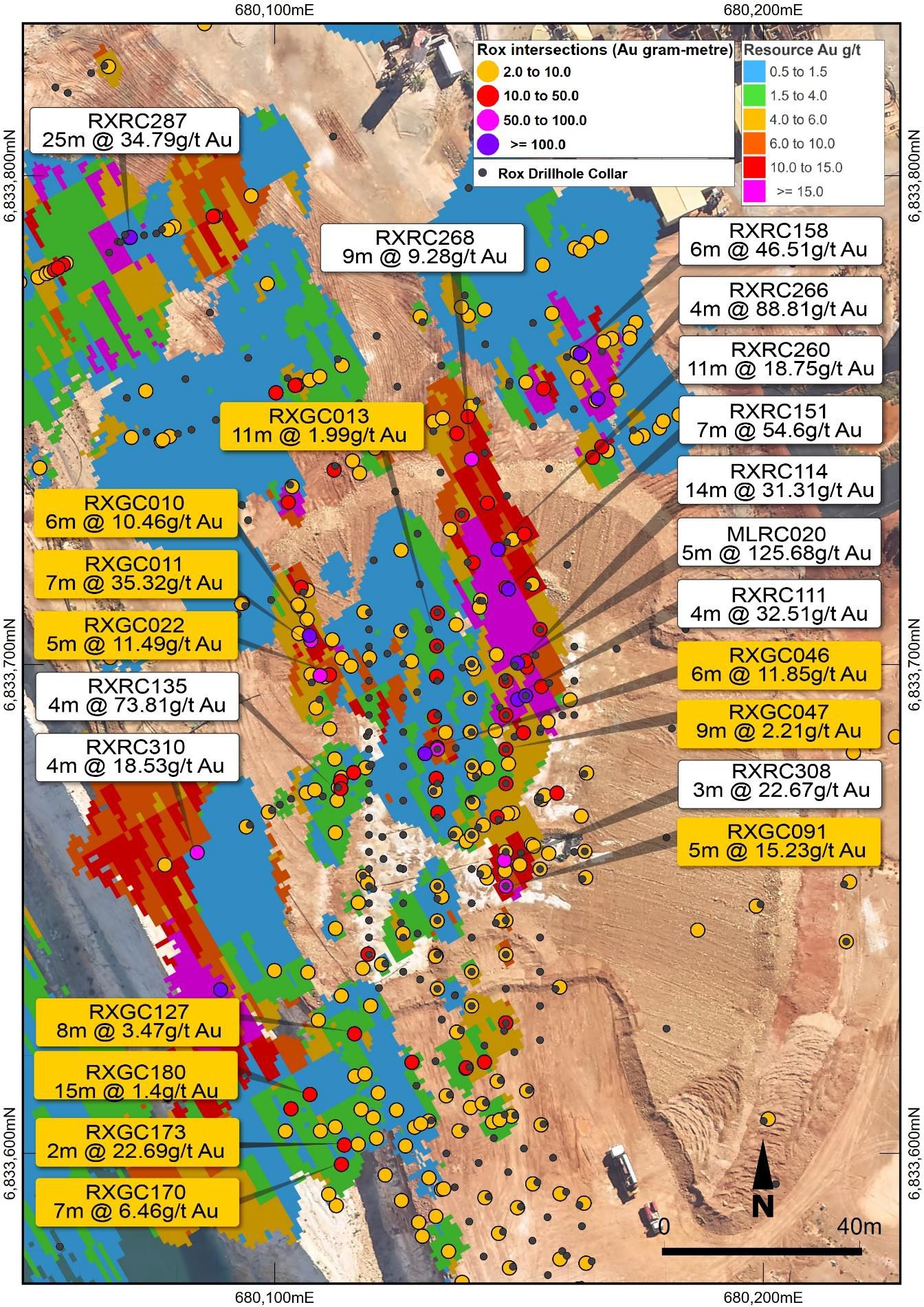RC grade control drilling was completed on a 5m x 5m intersection spacing down to a minimum depth of 40m vertically to compliment previous resource definition drilling by Rox. This encompasses an approximately 180m x 50m area. (Figure 1*).