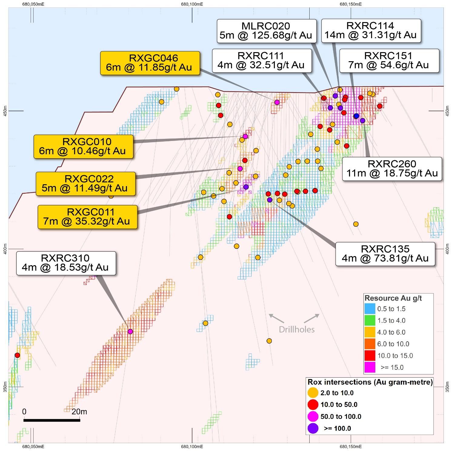 RXGC022: 5m @ 11.49g/t Au from 27m