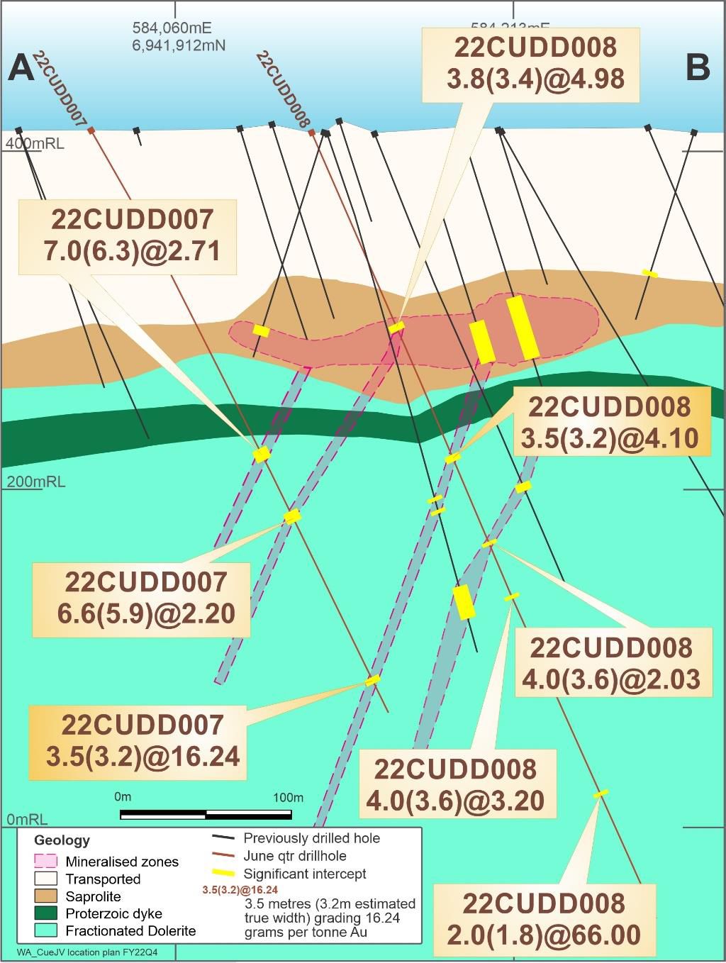- 3.5m @ 4.1g/t Au from 215m (22CUDD008), and