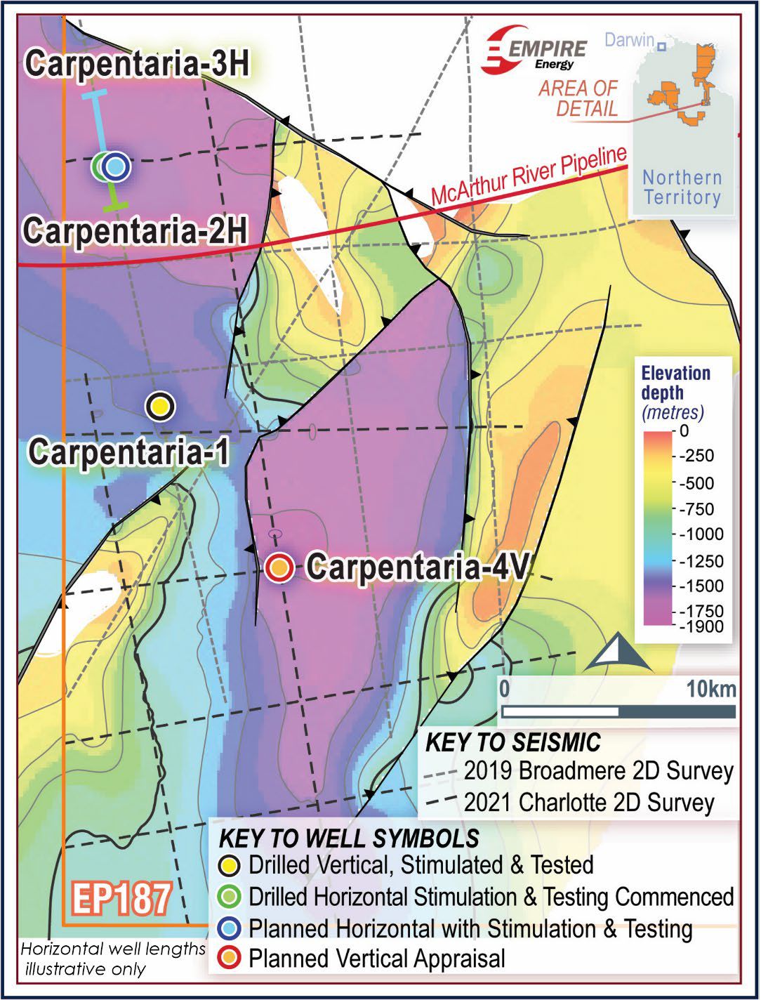 - Carpentaria-3H ("C-3H"), Empire's second horizontal appraisal well with a planned 2,000m horizontal section targeting the Velkerri B shale, has commenced drilling