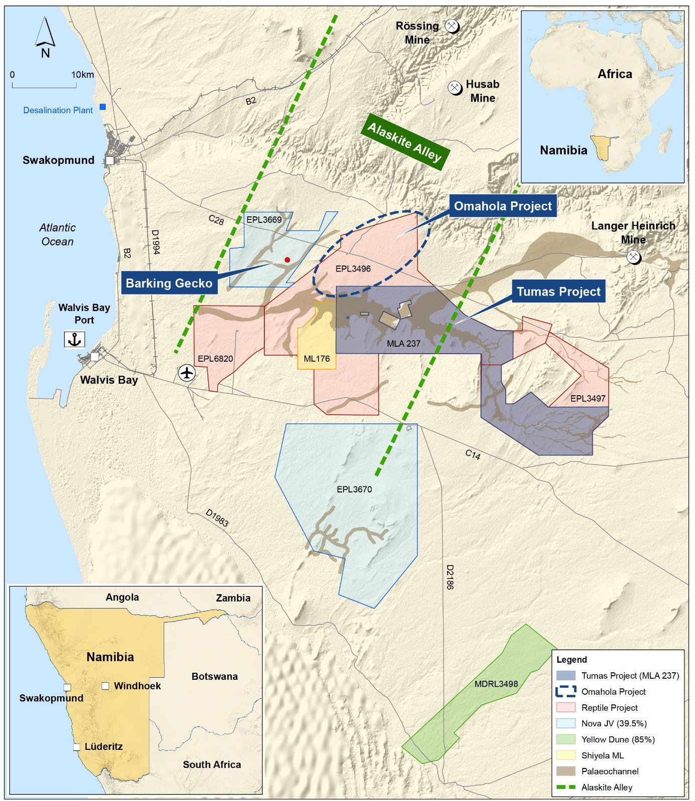Omahola comprises the Ongolo, MS7 and Inca basement-related deposits and is located on EPL3496, held by Deep Yellow through its wholly owned subsidiary Reptile Uranium Namibia (Pty) Ltd.