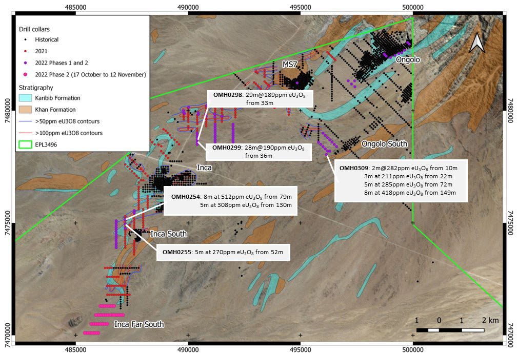 At Ongolo South, a distinct magnetic anomaly was targeted through hole OMH0309 (see ASX release 21 October 2022) and yielded uranium mineralisation with best intersections of: