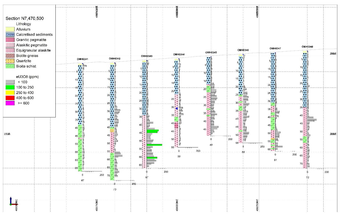 - OMH0254: 8m at 512ppm eU3O8 from 79m and 5m at 308ppm eU3O8 from 130m; and