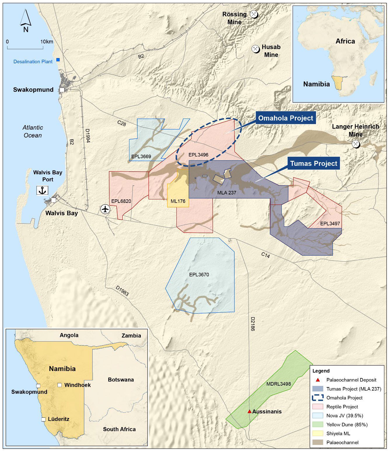 The deposit is held in the Yellow Dune Joint Venture by Deep Yellow, with 85% held through the Company's wholly owned subsidiary Reptile Uranium Namibia (Pty) Ltd (RUN), 5% through Epangelo Mining Company (Pty) Ltd (EMC) and 10% through Oponona Investments (Pty) Ltd (OI).