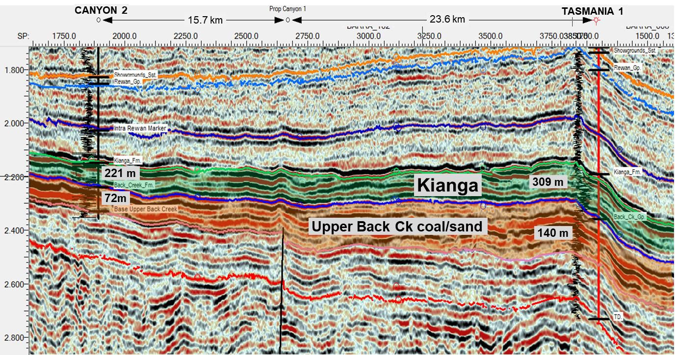 This line and the interpretation of the geological horizons demonstrate the connection between Canyon-2 and Tasmania-1 at the Permian Kianga and Back Creek reservoir levels. These large gas shows are not within a structural closure and are instead a Basin-Centred Gas play. Hydrocarbons have been generated from the organic material of the Kianga Formation (coals mainly) and the very thick Back Creek Group (marine sediments mainly and coals). The formations are collectively self-charged by hydrocarbons in a near basin-wide trap. The formations are usually greater than 2500m deep, (over 3300m deep at Canyon-2). The target reservoirs are characterised by low permeability sandstones, lesser siltstones and about 4% coal and overpressure (pressure above a normal water gradient).