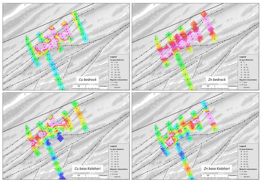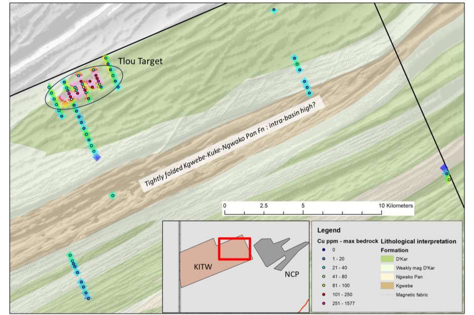 Tlou is in a high-priority setting for structurally controlled mineralisation associated with folding of target stratigraphy. The confirmation of copper in bedrock and base of Kalahari samples provides a strong indicator for underlying mineralisation.