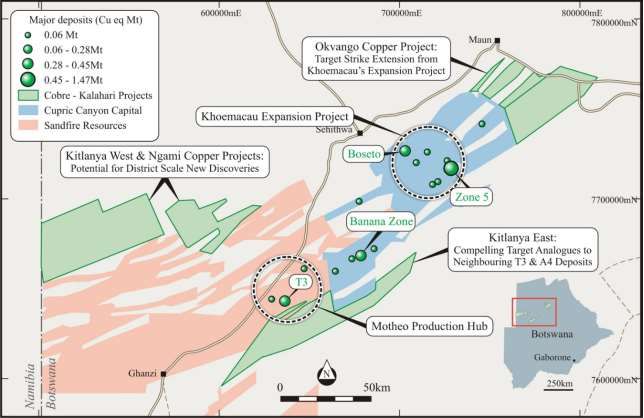 The Company is targeting analogues to the copper deposits in Khoemacau's Zone 5 development in the northeastern portion of the KCB. These include Zone 5 (92.1 Mt @ 2.2% Cu and 22 g/t Ag), Zeta NE (29 Mt @ 2.0% Cu and 40 g/t Ag), Zone 5N (25.6 Mt @ 2.2% Cu and 38 g/t Ag) and Mango NE (21.1 Mt @ 1.8% Cu and 21 g/t Ag). In addition, a number of doubly-plunging anticlines have been identified offering potential trapsites for analogous deposits to Sandfire's T3 and A4 deposits (combined reserve of 49.6Mt @ 1.0% Cu and 14g/t Ag).