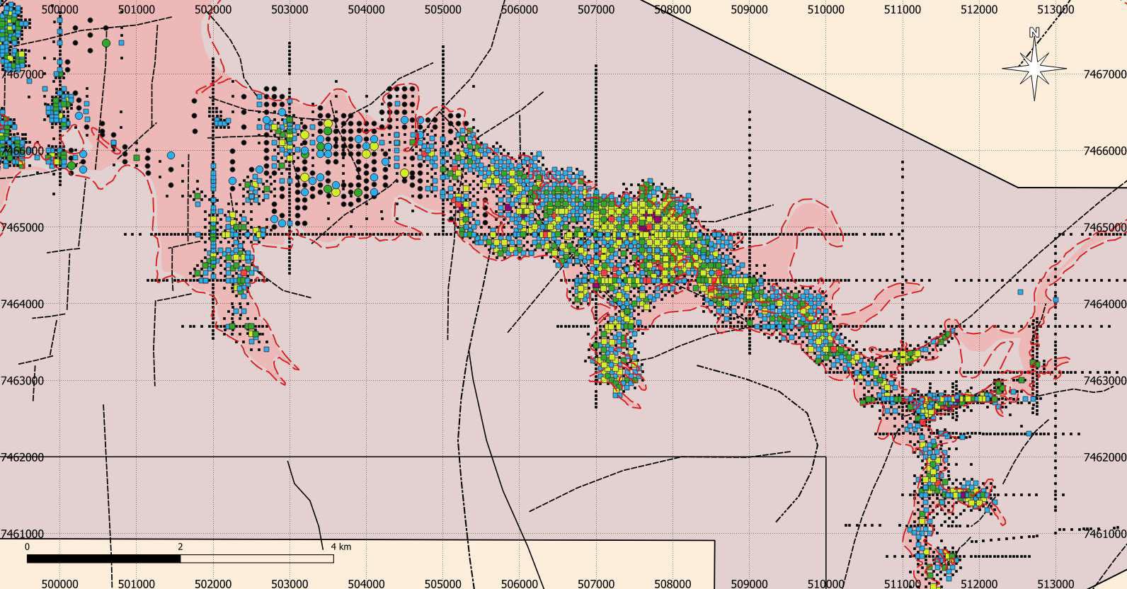 Phase 1 drilling was exploratory in nature, hence drill hole spacing varied between 100m and 200m along 200 to 1,000m spaced lines. The remaining 126 holes for 4,044m were drilled to infill an area of approximately 2.5km by 1.8km immediately to the west of Tumas 3 using a line and hole spacing of 100m (Phase 2).