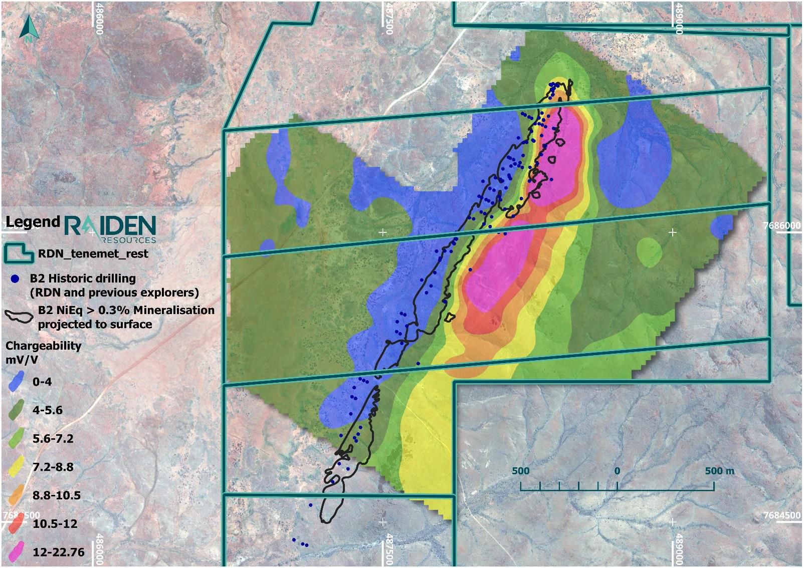The results from the initial 3.8km2 gradient array grid survey outlined a 1,000m x 200m chargeability anomaly which is offset to the east of the currently drill defined B2 Ni-CuPGE mineral resource area1 (Figure 1*). This chargeability response is hypothesised to define a potential zone of disseminated mineralisation, but drill testing will be required to prove this in the future.