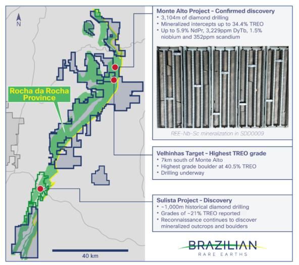 - The Sulista Rare Earth Project is located 80km southwest of the Monte Alto Project and the extensive dataset of historical drill results, surface hard rock outcrops, corestones/boulders and geophysical anomalies signals potential for a major rare earth endowment