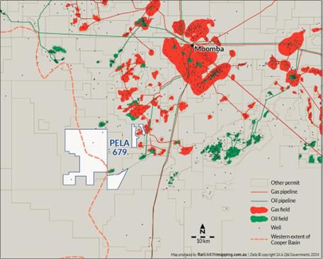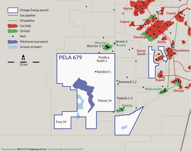 PELA 679 is located on the western flank of the Cooper Basin, south-west of the Worrior oil field which has produced in excess of 4.5 million barrels of oil. Comprising a total area of 393 km2 the permit is considered to hold Permian and Jurassic oil potential. Vintage has identified three Jurassic four-way closures and one Permian Patchawarra Formation stratigraphic play from the sparse 2D seismic it has mapped to date. The morphology of basement-influenced Jurassic structures located up-dip and along trend of Permian sourced hydrocarbons, is considered analogous to Beach Energy Ltd.'s prolific Western Flank oil fields.