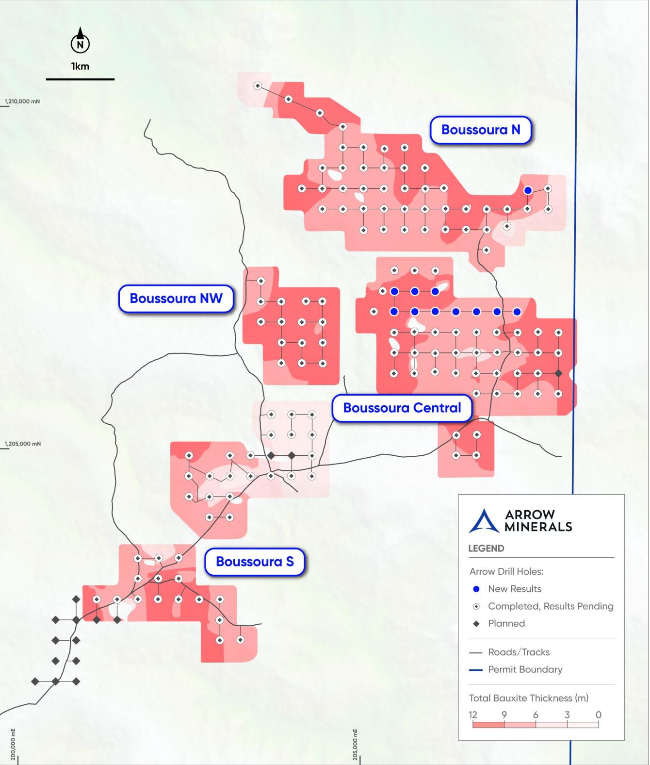 - Following the drilling of 180 holes (on 800 by 800 metres spacings) by Vale in 2007, Arrow has defined 9 bauxite exploration targets. Three are being tested in the current campaign