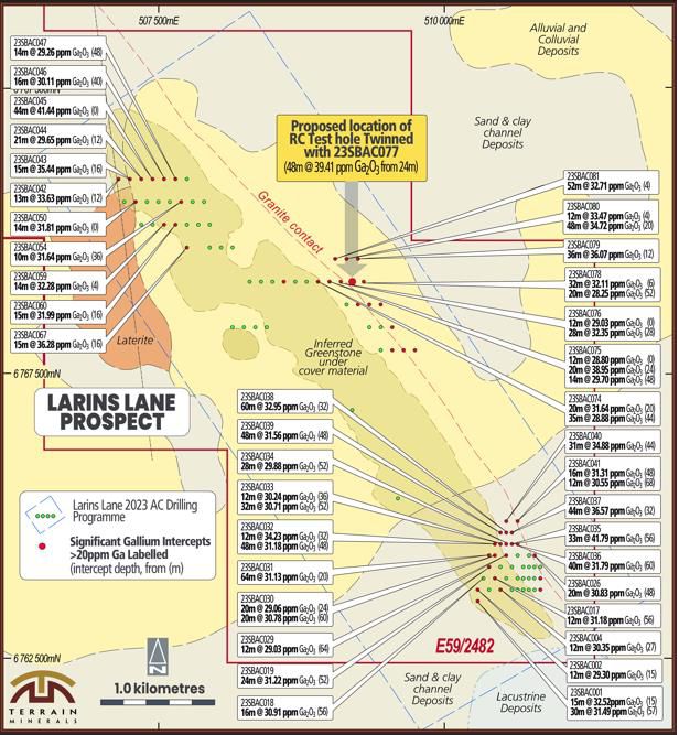 Terrain's geological team are currently in the field preparing for a follow-up RC program after the successful aircore Gold drilling program (refer ASX announcement released on 26 November 2024). At the same time, Terrain will twin a Gallium hole for metallurgical sample material (refer to Diagram 4*). The twinned hole sits within Terrain's recently announced JORC compliant exploration target (refer ASX announcement released on 6 November 2024). This study was compiled by SRK Consulting (Australasia) Pty Ltd ('SRK Consulting') and defined an initial Phase One Exploration Target for the Larins Lane Project located in the Mid-West region of Western Australia (see Diagram 1*).