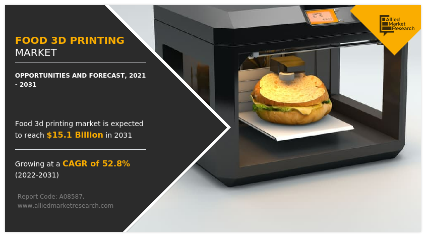WILMINGTON, DE, UNITED STATES, October 7, 2025 /EINPresswire.com/ -- The global food 3D printing market size generated $226.2 million in 2021, and is projected to reach $15.1 billion by 2031, growing at a CAGR of 52.8% from 2022 to 2031.The report offers a detailed analysis of the top winning strategies, evolving market trends, market size and estimations, value chain, key investment pockets, drivers & opportunities, competitive landscape and regional landscape. The report is a useful source of information for new entrants, shareholders, frontrunners and shareholders in introducing necessary strategies for the future and taking essential steps to significantly strengthen and heighten their position in the market.