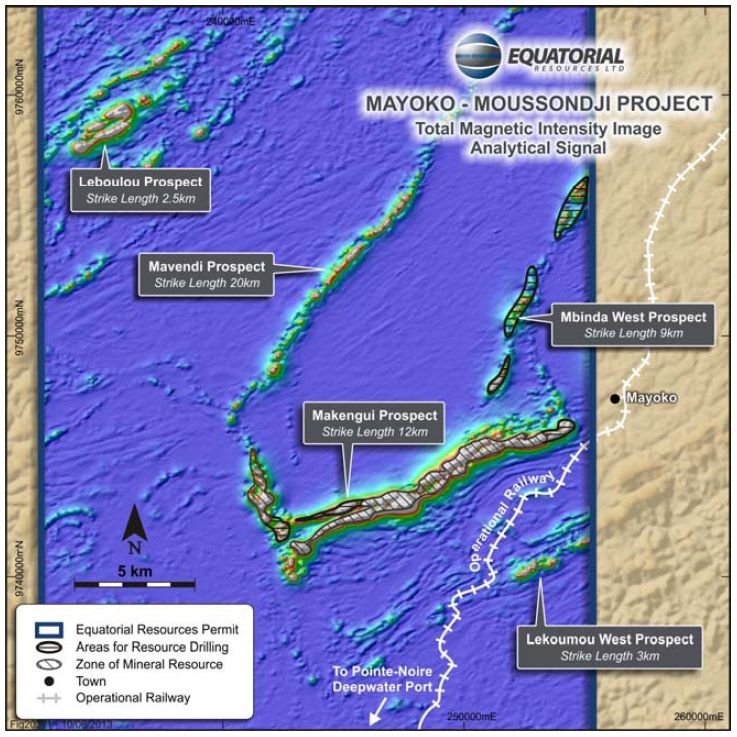 In December 2011 Equatorial was granted 100% ownership of two new Prospecting Authorisations for iron over areas surrounding Mayoko-Moussondji (refer ASX announcement dated 8 December 2011). The Moussondji Prospecting Permit is located directly to the East of Mayoko-Moussondji and the Oubouéssé Prospecting Permit is immediately to the South. The Permits cover areas within the Chaillu Massif region and are considered highly prospective for iron mineralisation similar to Mayoko-Moussondji, Exxaro’s Mayoko project and the nearby Zanaga iron project being developed by GlencoreXstrata.