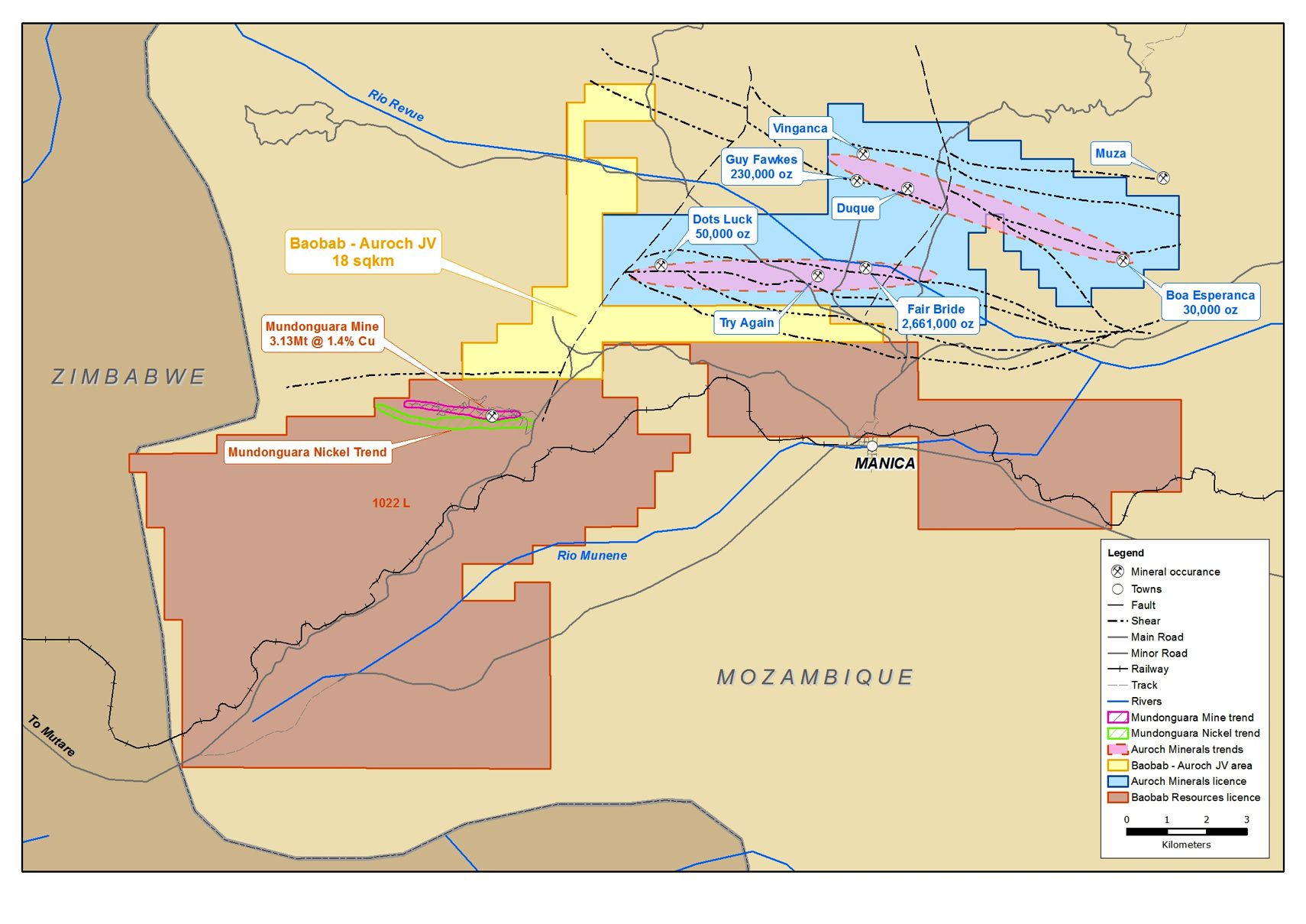 - The Area of Interest encompasses the northern 18km2 of Baobab's 145km2 1022L Exploration Licence and overlies the along strike structural continuations of Auroch's 3Moz Manica Gold Project (3990C Mining Concession).
