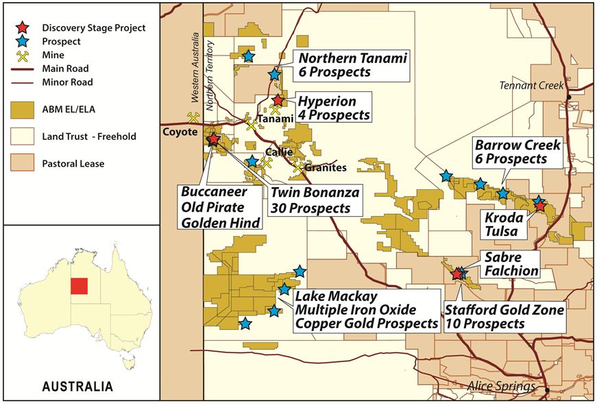 Subject to completion of the agreement, ABM is transferring ownership of the North Arunta Regional Projects to Clancy. The North Arunta Projects are between 200 and 500 kilometres from ABM's flagship Old Pirate Gold Project and cover an area of 12,780 square kilometres. The area includes a number of gold and base metal prospects including the Kroda Prospect (Au), the Tulsa Prospect (Au), the Reward Prospect (Cu- Ag-Au), the Sabre / Falchion Prospect (Au-Sb) and the Waldrons Hill Prospect (Au).