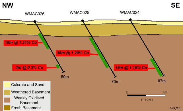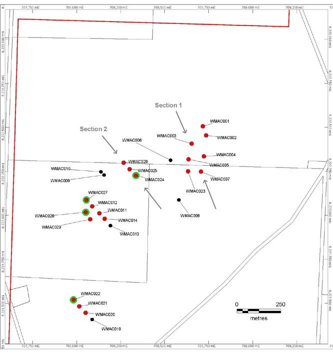 Holes WMAC011, 12, 14, 24, 27, 28 and 29 intercepted primary sulphides, with the aircore rig drilling to relatively shallow refusal. Four holes ended in copper mineralisation. These holes are being considered for extension utilising diamond drilling to test for further mineralisation extension potential at depth. This will complement the copper mineralisation intercepted at shallower depths open laterally in all directions.