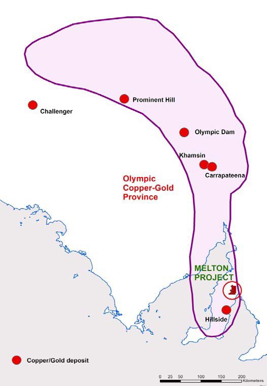 In addition to these discoveries, the Olympic Dam resource has grown significantly by 48 Mt of contained copper in the past ten years - more than the aggregate of all significant Australian copper discoveries in that time. The Melton projects are strategically located on Yorke Peninsula in South Australia, less than 200 km from Adelaide, with good access to infrastructure which includes road and ports. The Melton projects also cover the northern extension of the Pine Point Fault and contain a number of discrete magnetic and gravity features consistent with copper-gold mineralisation elsewhere along the fault.