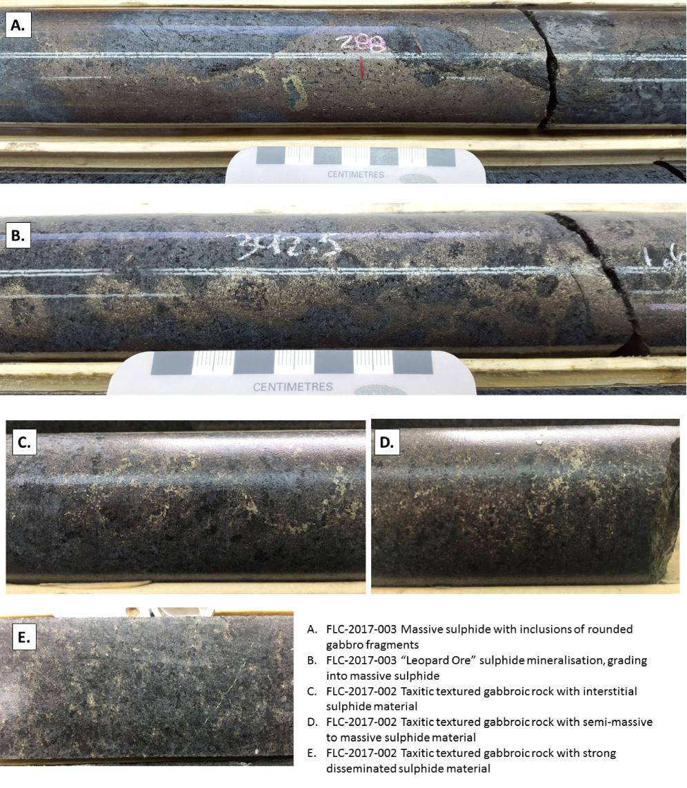 Sulphide content throughout holes FLC-2017-002 and FLC-2017-003 grades from weakly disseminated to strongly disseminated, interstitial and matrix style mineralisation. The best mineralisation intersected to date is within hole FLC-2017-003 which returned massive to semimassive sulphide over 4.5 metres (388 to 392.5 metres downhole), within a larger zone of approximately 25 metres of strong sulphide mineralisation.