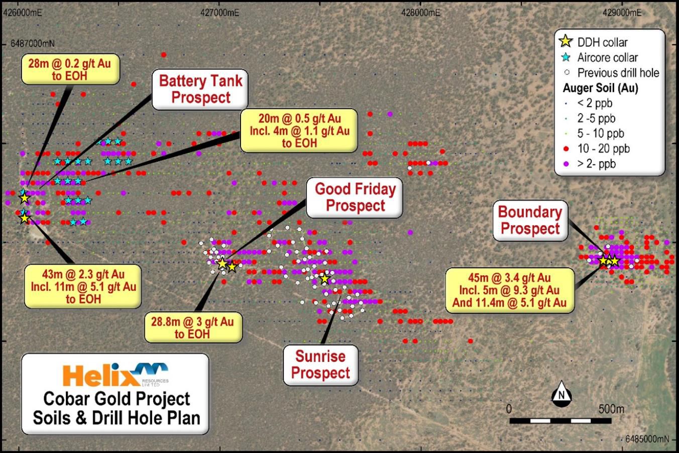 - Drilling is targeting high-grade gold at four advancing gold prospects being Battery Tank, Good Friday, Sunrise and Boundary.