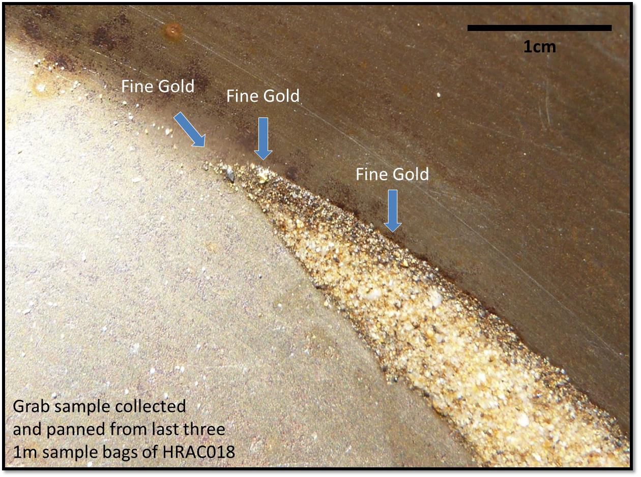 HRAC018: 43m @ 2.3g/t Au from surface to EOH, including 11m @ 5.1g/t Au to EOH, where visible gold was panned from samples at the end of the intercept (refer figure 2 in the link below).