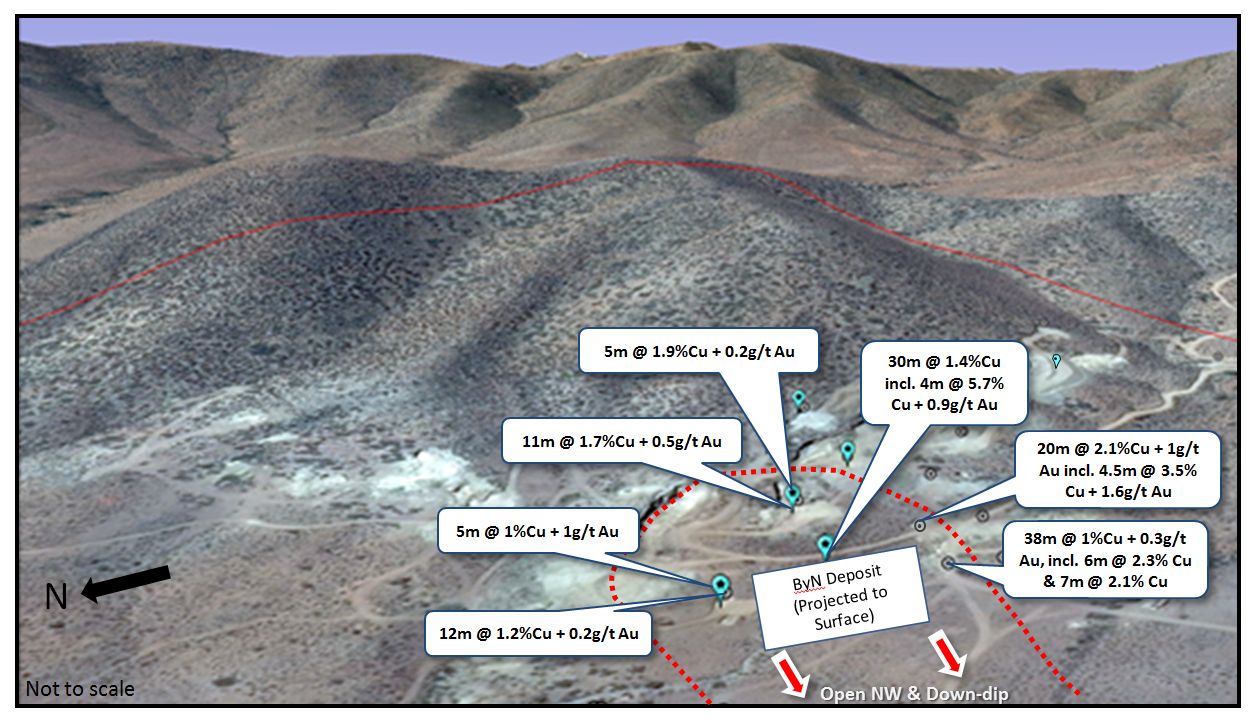 Drilling at ByN has intersected copper and gold mineralisation with results including 19.5m @ 2% Cu and 1.1 g/t Au and 30m @ 1.4% Cu and 0.3g/t Au. The deposit remains open to the northwest along strike and down dip (see Figure 8 in the link below).