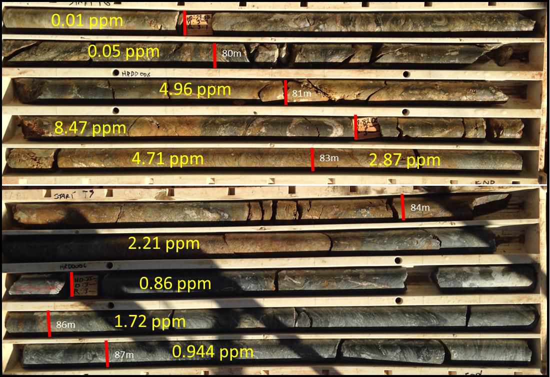 HRDD004: 1.3m @ 4.3g/t Au within 7.6m @ 1.5g/t Au from 29m, within a broader zone of 45m @ 0.4g/t Au from 0m. The hole was collared nearby and drilled at an oblique angle to the discovery hole. The hole has intersected the discovery zone up-dip.