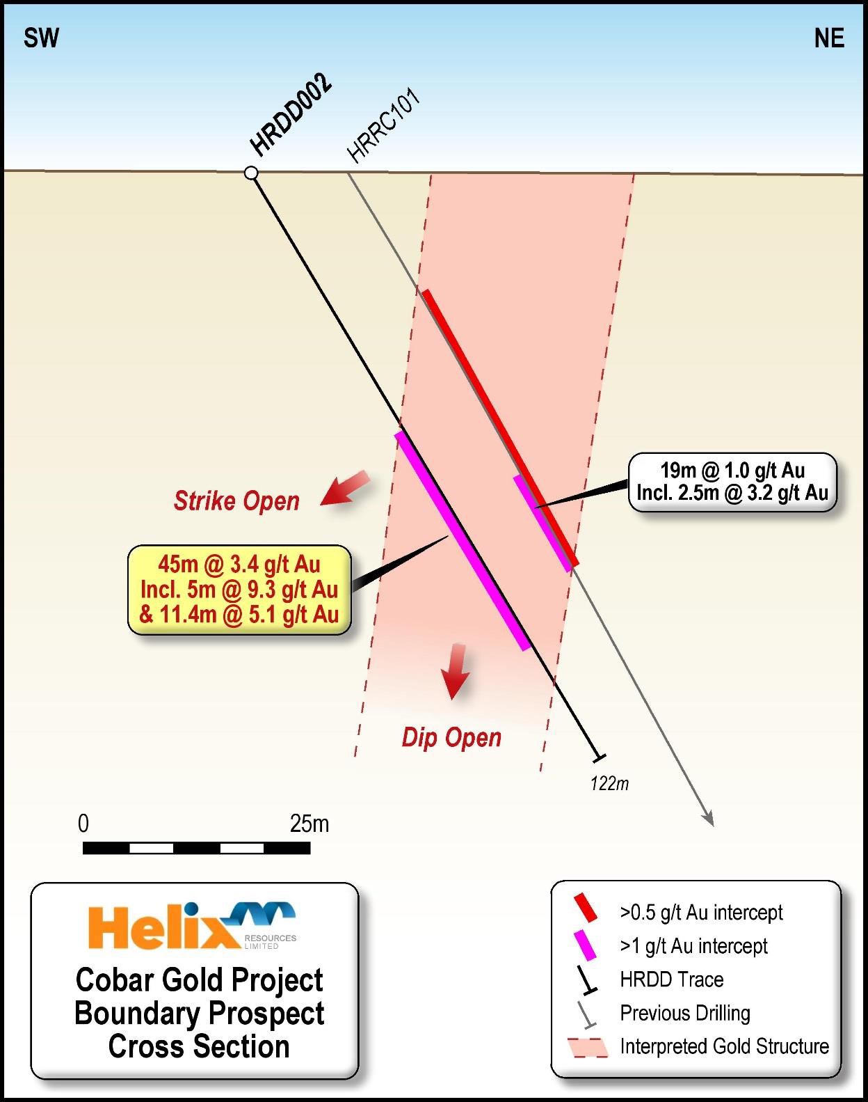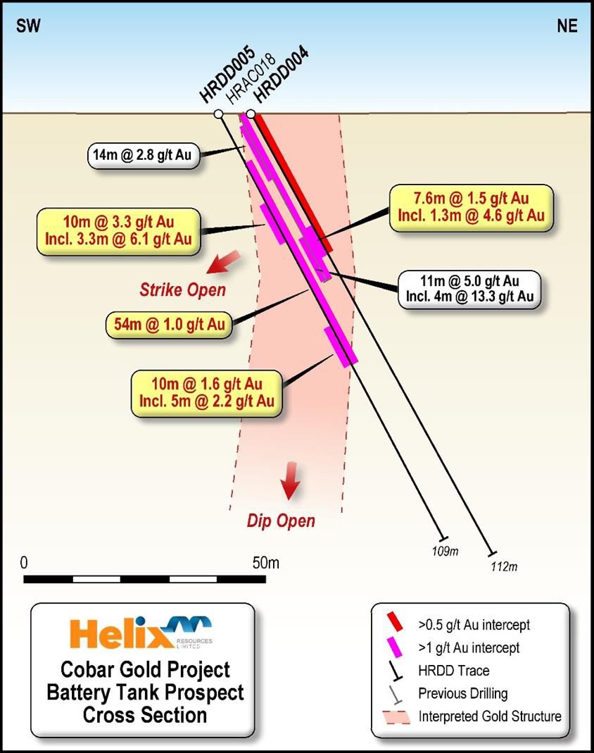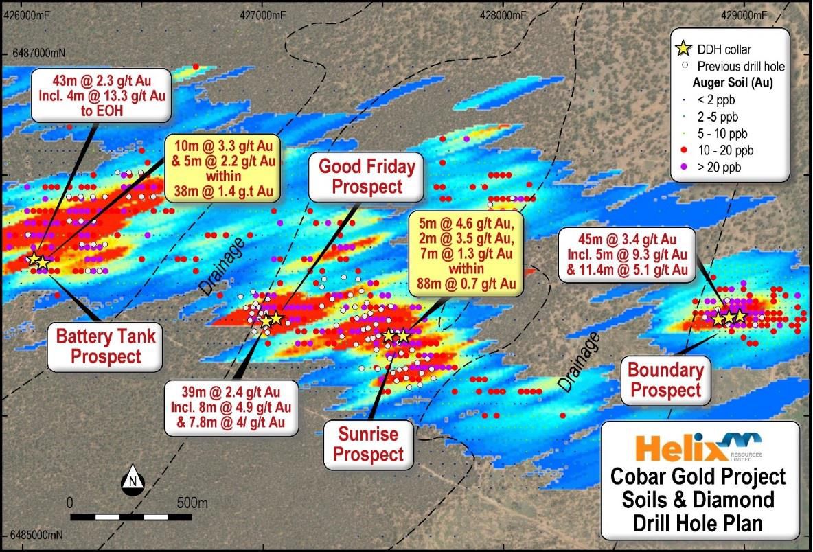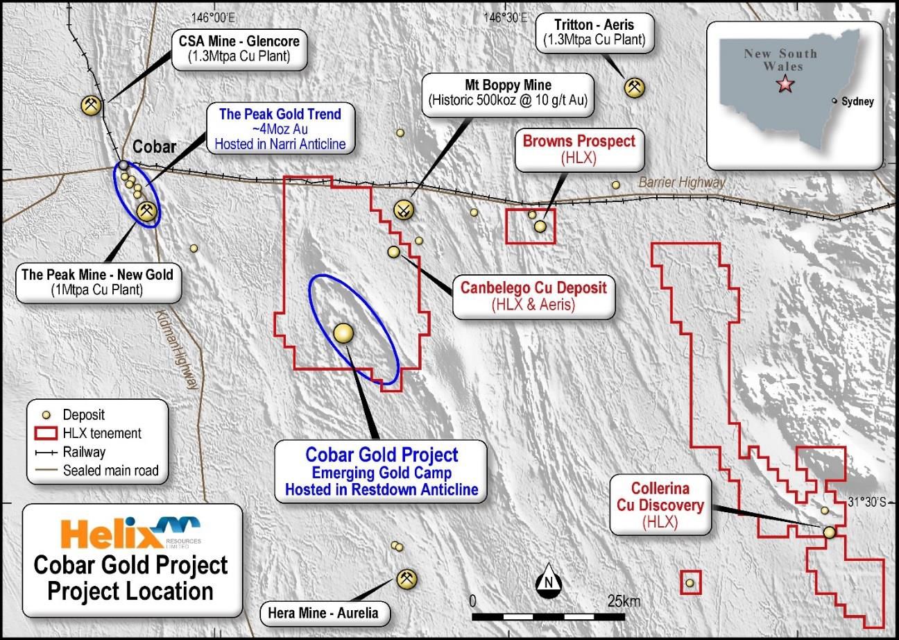 - Recent drilling at Helix's Cobar Gold Project in NSW has returned significant gold intercepts from shallow depths at two additional prospects: