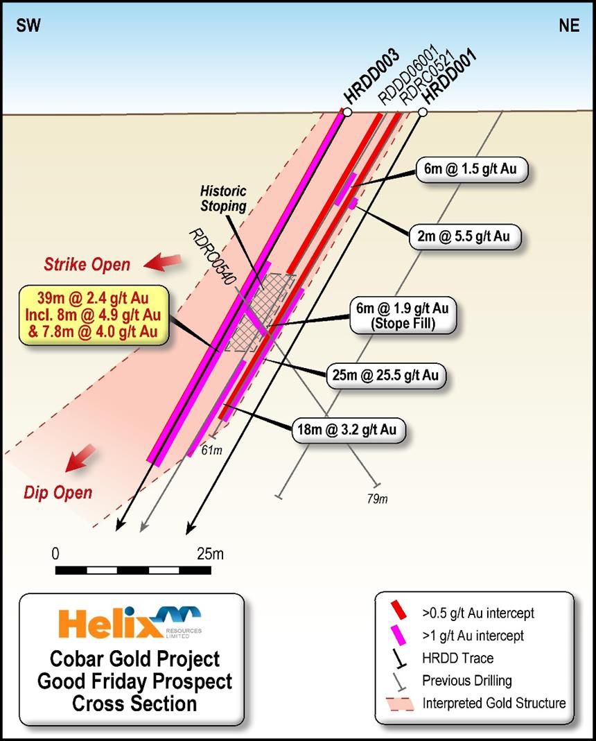The extensional drilling of HRDD003 has increased the high-grade zone at the Good Friday Prospect by approximately 10m, whilst HRDD001 extension is interpreted to be drilled underneath the mineralised shoot (refer figure 5 in the link below). The new structural interpretation provides scope for this zone to extend along a north-easterly strike with a possible plunge component to the higher grade gold.