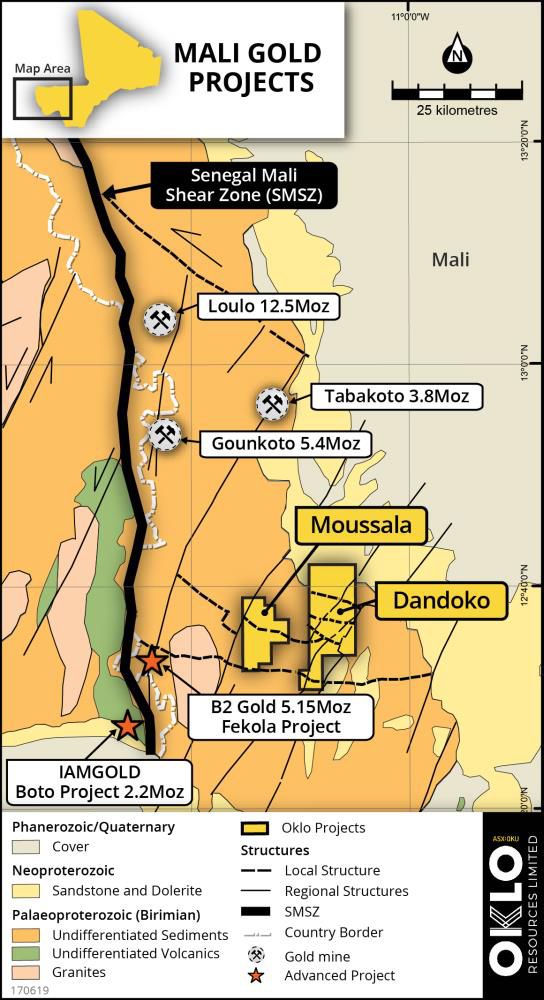 Oklo's Dandoko Project and adjoining Moussala Project are located within the Kenieba Inlier of western Mali and lie within 30km to the east of B2Gold's 5.15Moz Fekola Project and 50km to the south-southeast of Randgold's 12.5Moz Loulo Mine.
