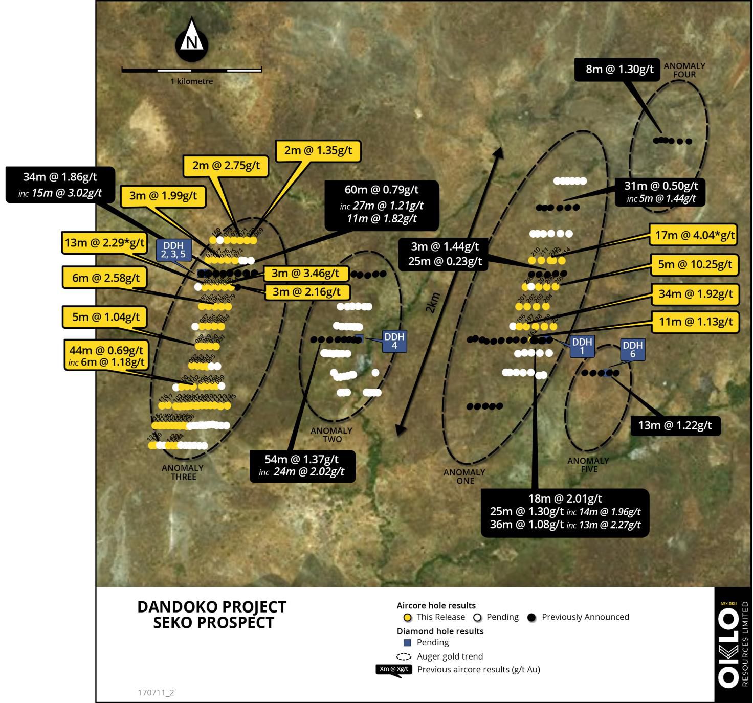 As previously announced (refer ASX Announcement 21st June 2017 "Diamond Drilling Successfully Confirms Seko at Depth") a first pass stratigraphic DD drilling program, comprising 6 holes for 961m, was recently completed testing four separate anomalies at Seko (Anomalies 1, 2, 3 and 5, Figure 2). The DD program was designed to provide valuable geological and structural information on the primary mineralisation below the previously reported significant AC drilling results to assist in the planning of deeper RC drill holes. All holes were angled at -55deg and achieved a maximum downhole depth of 221m (vertical depth ~180m).